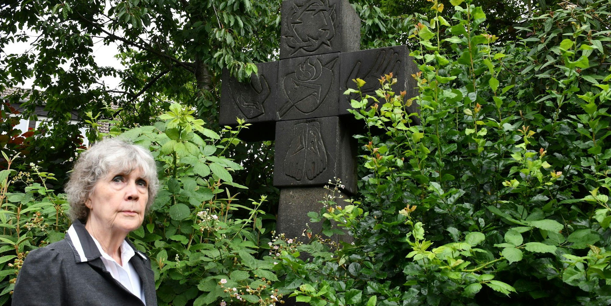 Alt-Hürth – Das massive Basaltkreuz vor dem Eingang zum Friedhof an der Brandlstraße gilt als eines der spektakulärsten Werke des Kölner Bildhauers, Gold- und Silberschmieds Prof. Hein Wimmer (1902-1986). Doch hinter wuchernden Büschen ist das 1962 aufgerichtete Wegekreuz kaum mehr zu entdecken. Die SPD-Kulturpolitikerin und Ratsfrau Margit Reisewitz will sich dafür einsetzen, dass das Kunstwerk wieder sichtbar gemacht und in die Denkmalliste eingetragen wird.