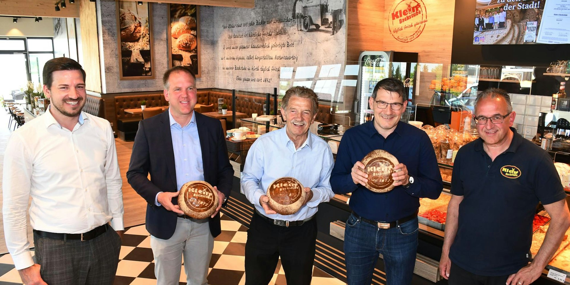 Zur Eröffnung der neuen Bäckerei-Filiale kamen André Klein, Bürgermeister Dirk Breuer, Seniorchef Willi Klein, Oliver Klein und Vertreibsleiter Uwe Nieswandt (v. l.).