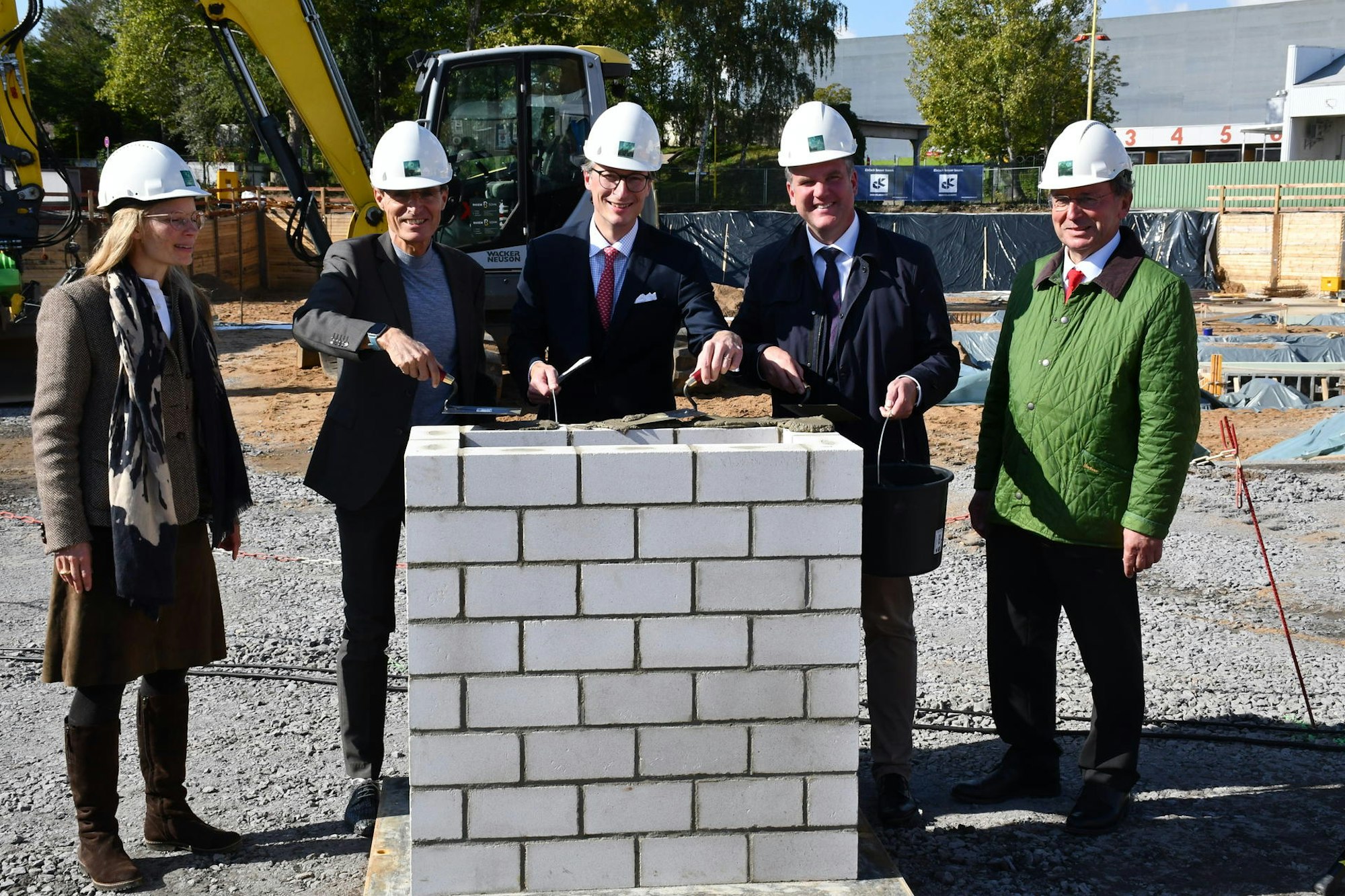 Zur Maurerkelle griffen Isa von Bismarck-Osten, Stadtbaudirektor Manfred Siry, Leopold von Bismarck-Osten, Bürgermeister Dirk Breuer und Caritas-Vorstand Peter Altmaier (v.l.).