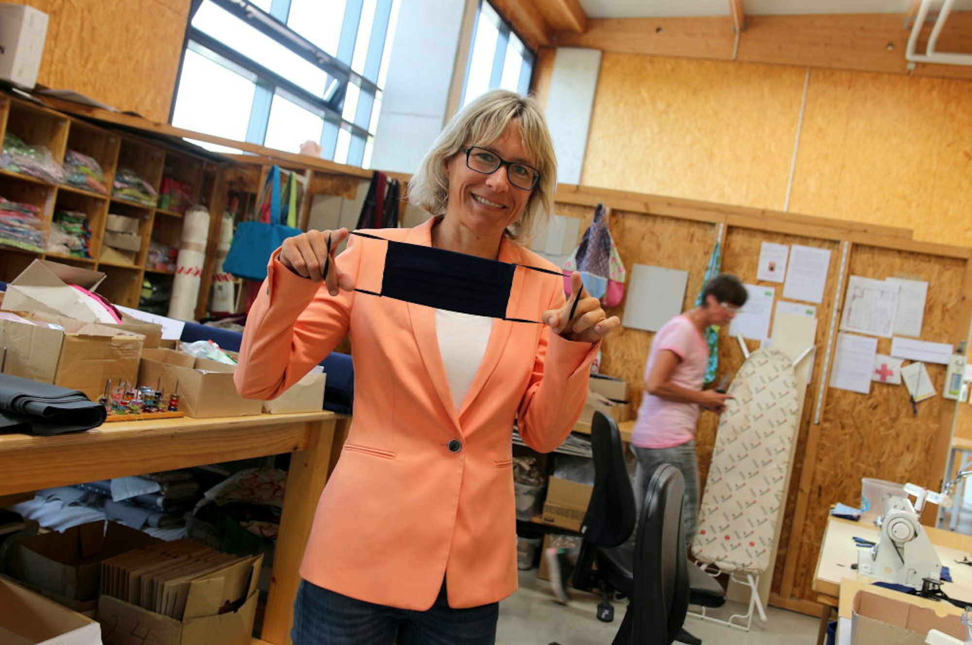 Werkstattleiterin Birgit Hummel zeigt eine der Behelfsmasken, die Grit Landsberg näht.