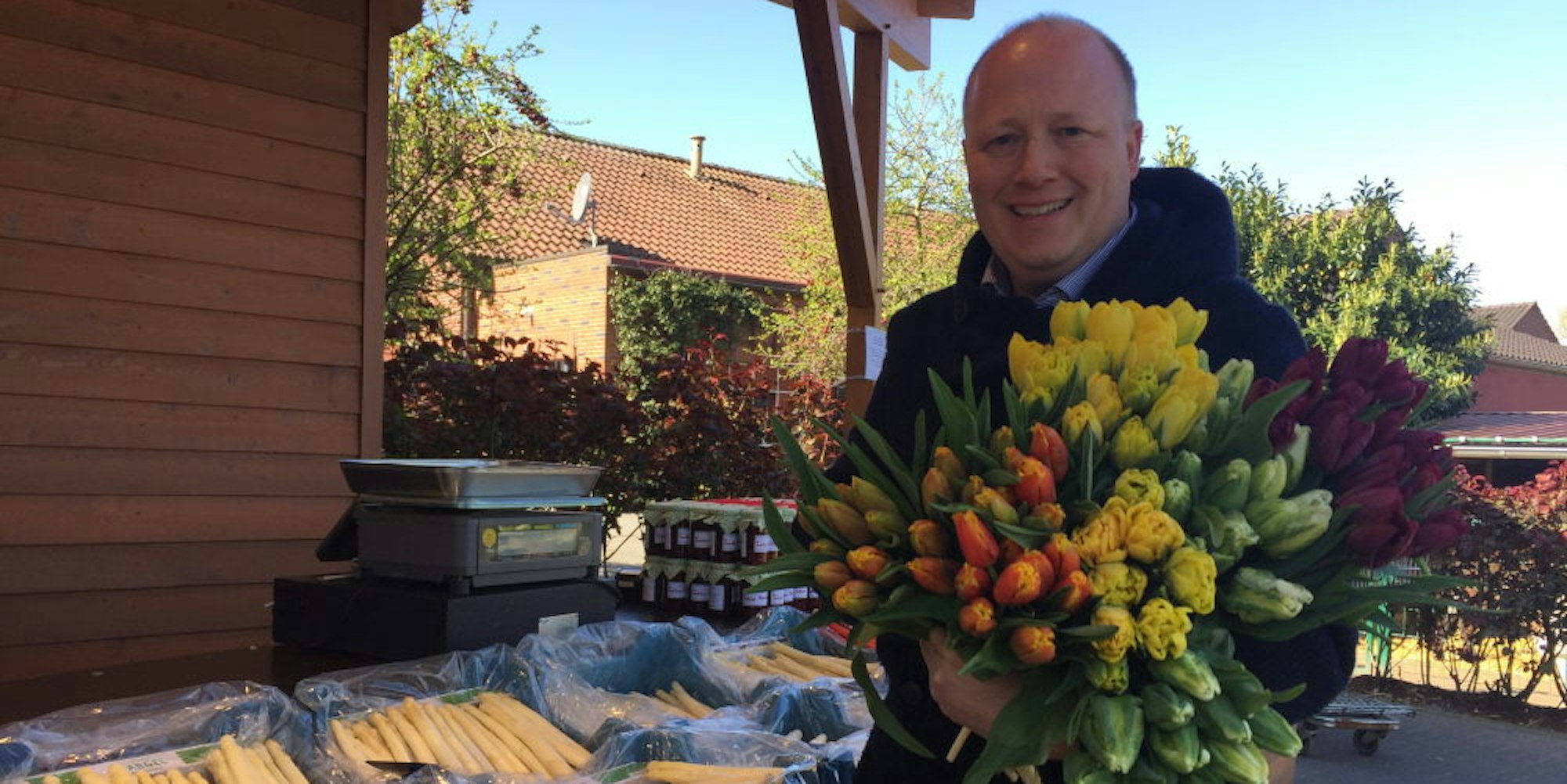 30 Tulpen aus dem eigenen Anbau kosten 9,90 Euro. Für die Lieferung kommen noch mal 4,90 Euro drauf. Zum Spargel können auch Schinken, Kartoffeln, Soße und Wein bestellt werden. Zum Angebot gehören auch ein Suppentaxi, das drei eingeweckte Suppen vom Hof liefert und eine Bauernkiste mit Kartoffeln, Äpfeln, Eiern, Apfelsaft und Milch. An bestimmten Tagen wird die Ware in Köln und in den Städten im Rhein-Erft-Kreis ausgefahren.