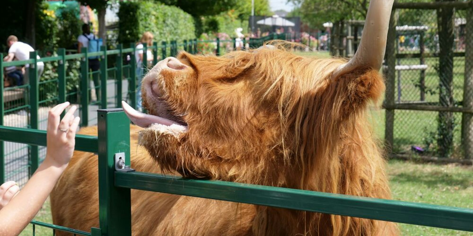 Ein freundlicher Highlander passt sich den scheuen Kleinen an, öffnet kinderfreundlich weit sein Maul und streckt seine Zunge heraus, damit die Besucher das Essen direkt einwerfen können. Das hat jedoch Nachteile fürs Tier – nicht jeder ist treffsicher. Ein Wildschwein nutzt das aus und mampft alles auf, was auf dem Boden gelandet ist.