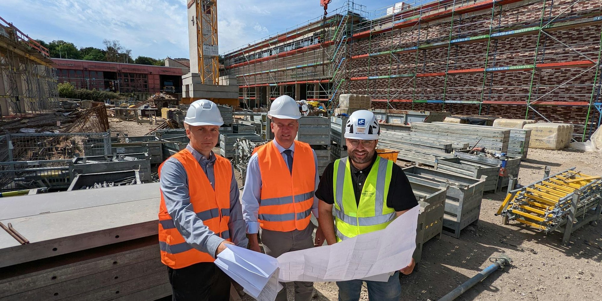 Über die Baufortschritte freuen sich Thomas Pehlke (Gebäudeamt), Bürgermeister Dirk Breuer und Bauleiter Marco Verna.
