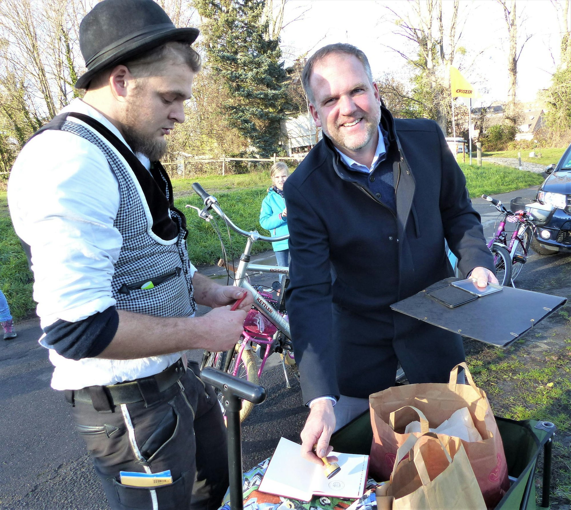 Ist ein Wandergeselle länger an einem Ort, holt er sich im Rathaus den Stempel der Stadt. Deshalb bat Moritz David Bürgermeister Dirk Breuer, ihm beim Abschied das erste Stadtsiegel ins Wanderbuch zu drücken. Die beiden sind sich bereits begegnet, beim Pfadfinderstamm Saporoger und dem kleinen Karnevalsverein Ringelsöckche Rut-Wieß 1997, dessen Präsident Breuer ist; David half bei Umzügen als Wagenengel aus.
