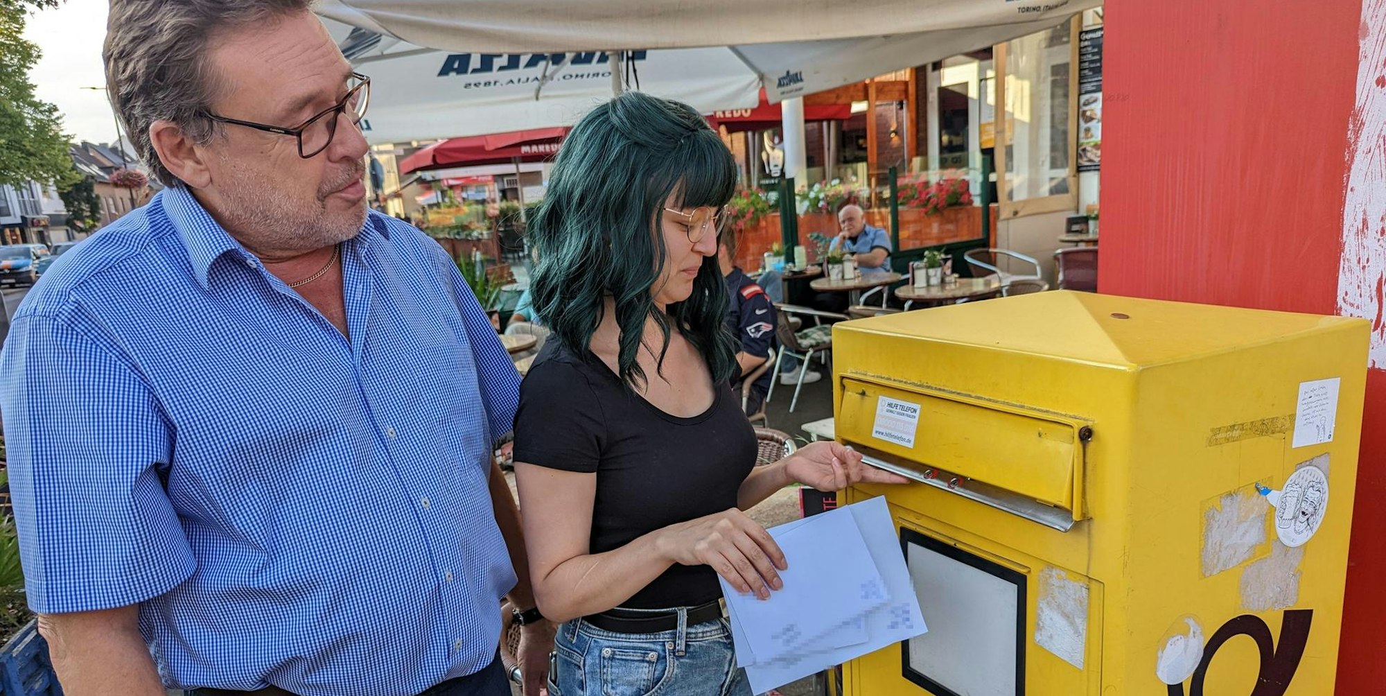 „Das ist der am häufigsten genutzte Briefkasten in Efferen“, ist der Ortsvorsteher sicher und verweist auf die Lage am Ende der belebten Einkaufsstraße und nahe der Stadtbahnhaltestelle. Entsprechend viele Beschwerden seien bei ihm eingegangen. Vor Ort muss er nicht lange warten, um die nächsten Postkunden zu beobachten, die mitsamt ihrer Briefe wieder abziehen.