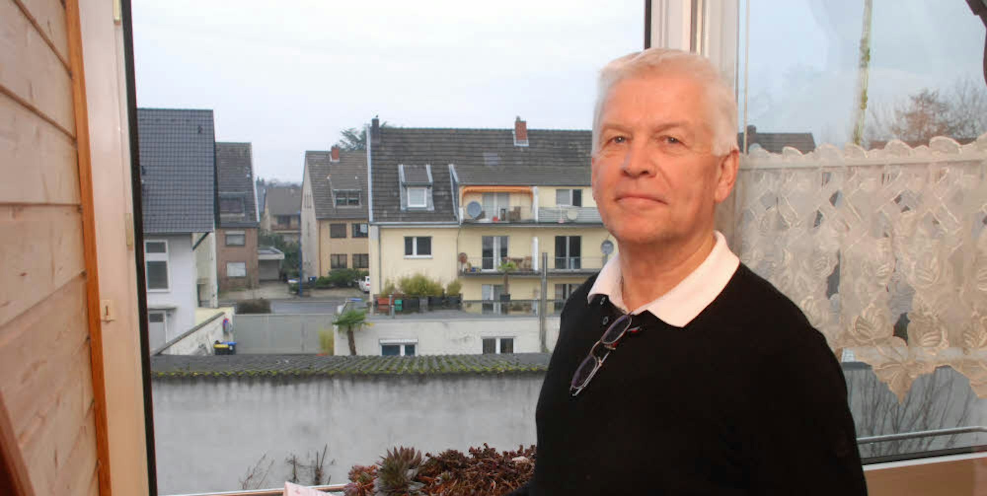 Aus dem Fenster blickt Volker Oertel auf die Rückseite der Garagen. Er möchte, dass die Wand als Sichtschutz erhalten bleibt.