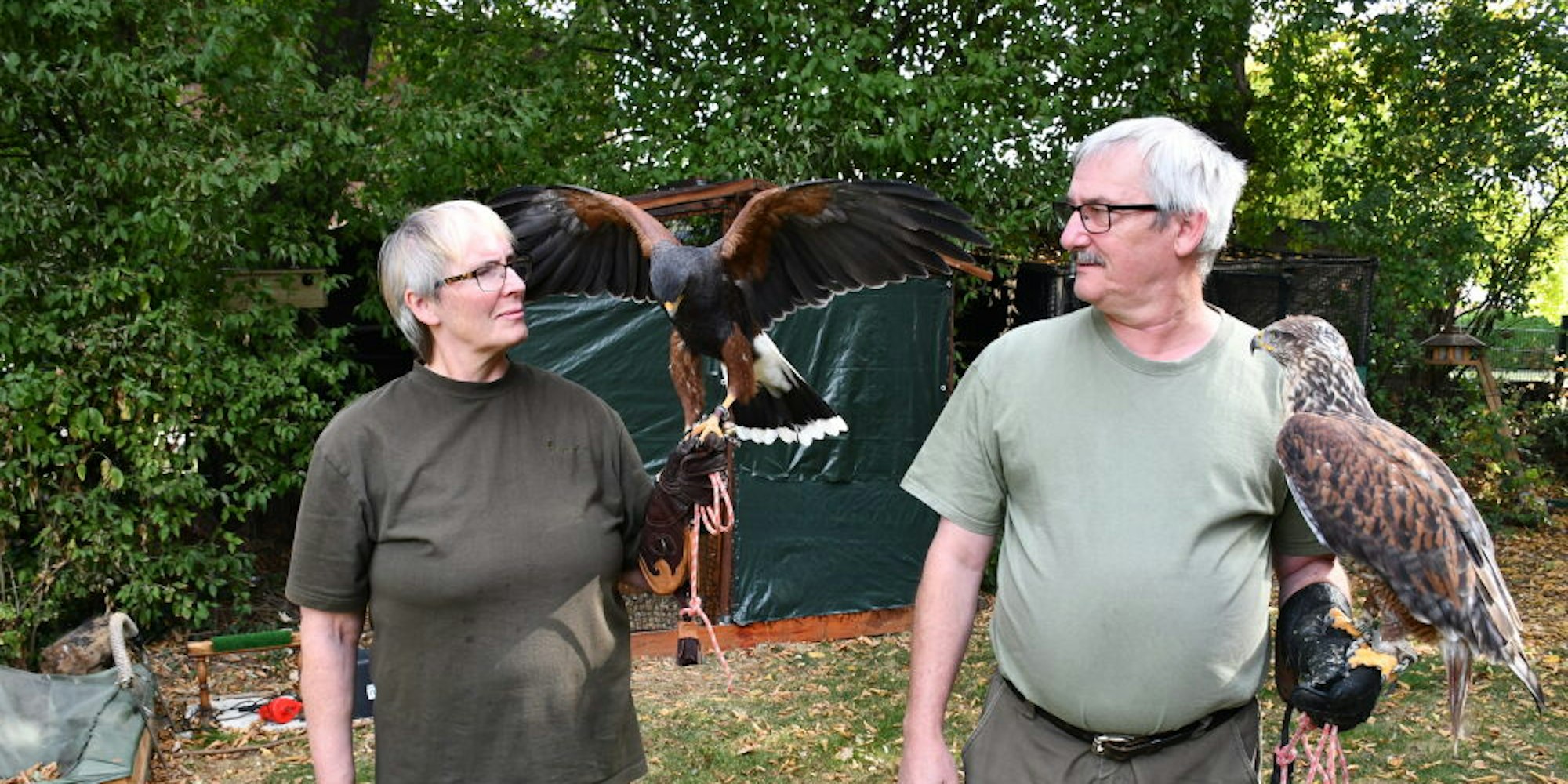 Neun Greifvögel hält das Falkner-Ehepaar Elfriede und Robert Schmitz, darunter die beiden Bussarde.