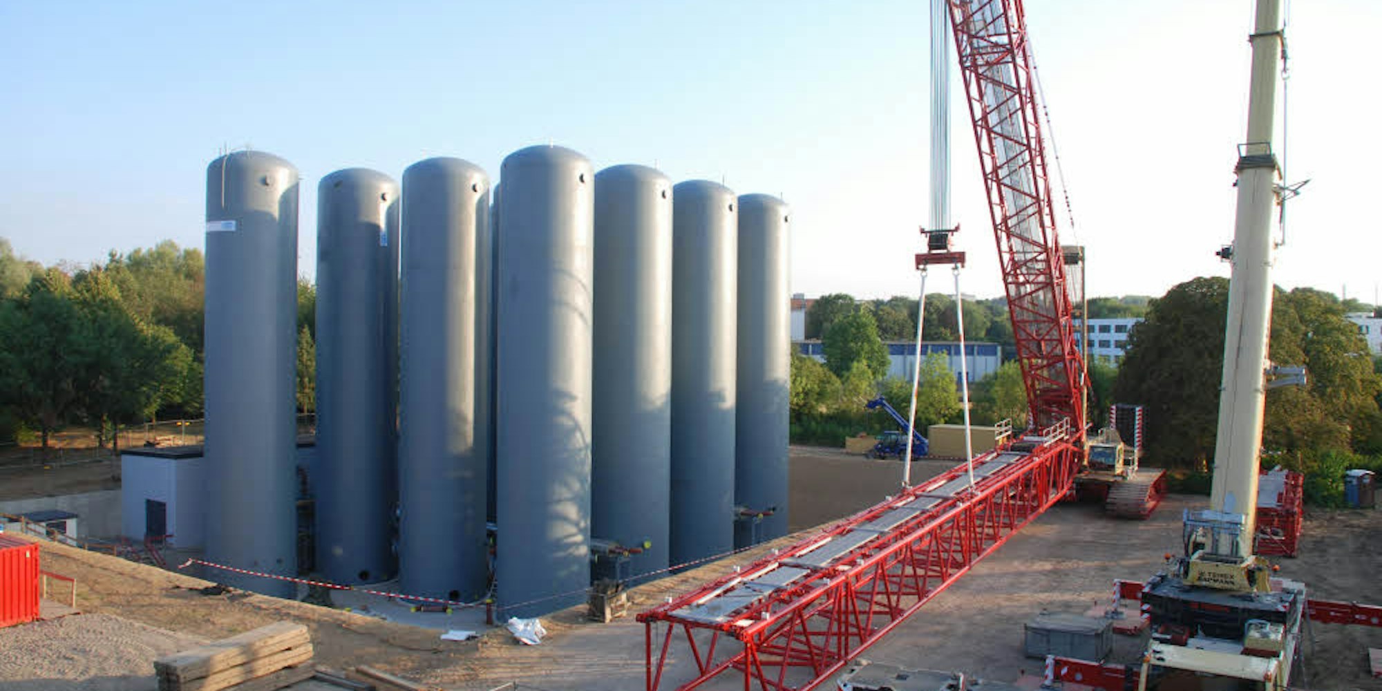 Das aufgeheizte Wasser wird über eine neue, 3,8 Kilometer lange Leitung nach Hermülheim gepumpt. Dort entsteht, in zentraler Lage des 245 Kilometer langen Fernwärmenetzes, der 6,5 Millionen Euro teure Wärmespeicher. In den kommenden Wochen werden die zwölf Speicher- und ein Überlaufzylinder untereinander verrohrt, jeweils vier in Reihe.