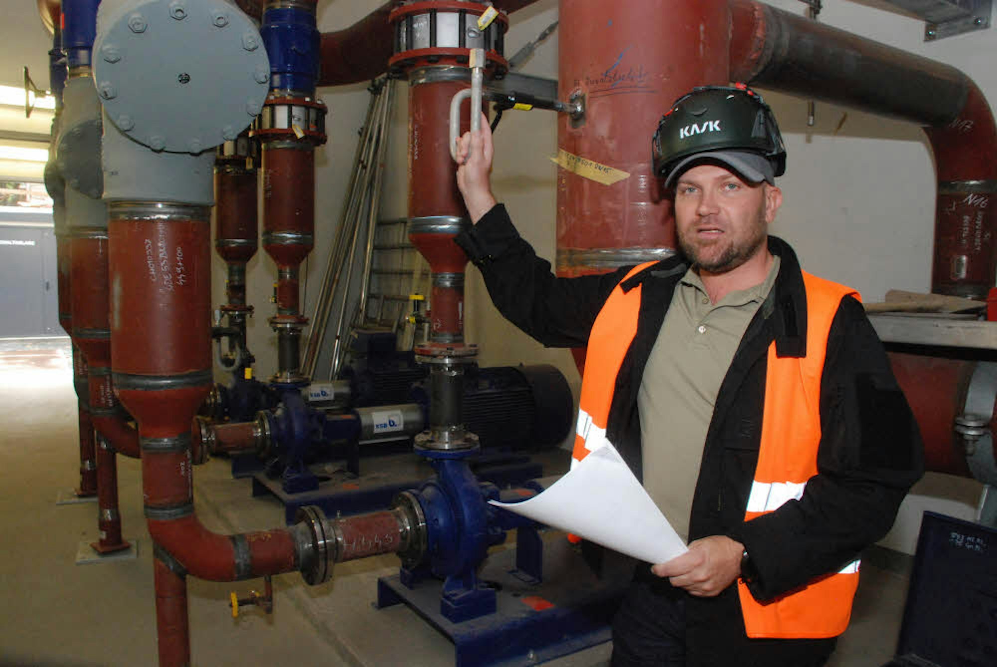 Projektleiter Mike Woltering hat den Überblick, auch über die zahlreichen Leitungen im Betriebsgebäude des Wärmespeichers.
