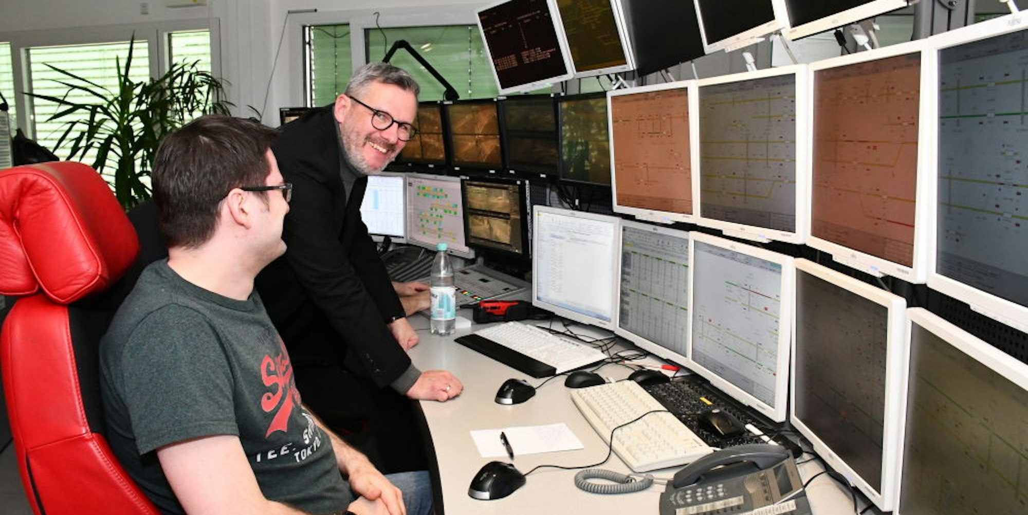 Auf eine Wand von Computerbildschirmen blicken die Fahrdienstleiter. Netzbetriebschef Günther Wischum (r.) achtet auf ein gutes Klima.
