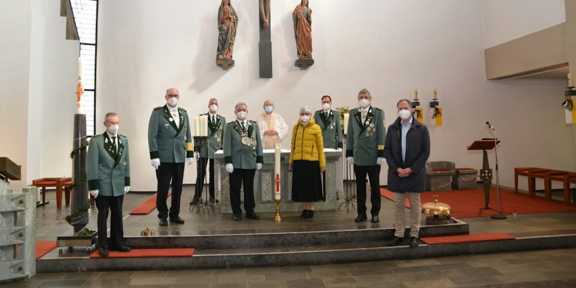 Eine Abordnung der St.-Hubertus-Schützenbruderschaft überreiche die Corona-Kerze während des Gottesdienstes an Pfarrvikar Werner Friesdorf. Der Geistliche segnete die Kerze.
