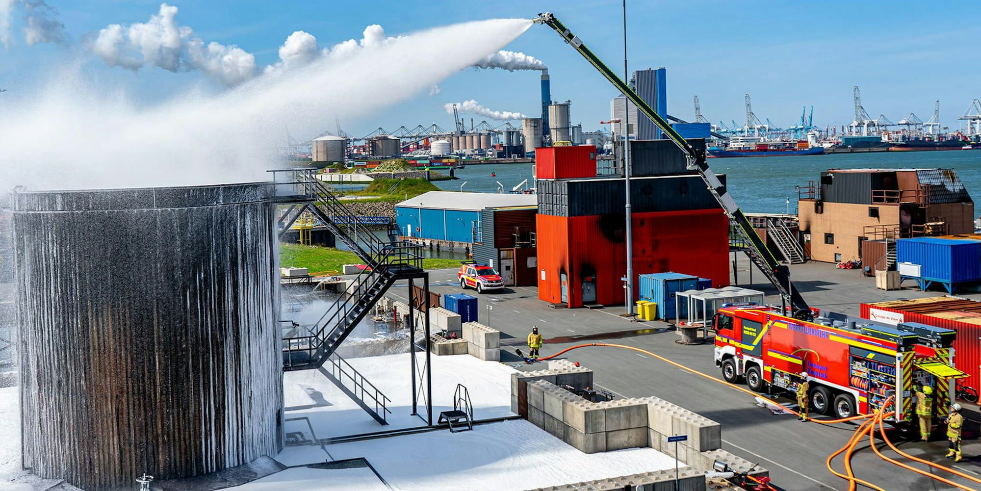 Den Ernstfall geübt haben Feuerwehrleute mit dem neuen Fahrzeug bei der Hafenfeuerwehr in Rotterdam.