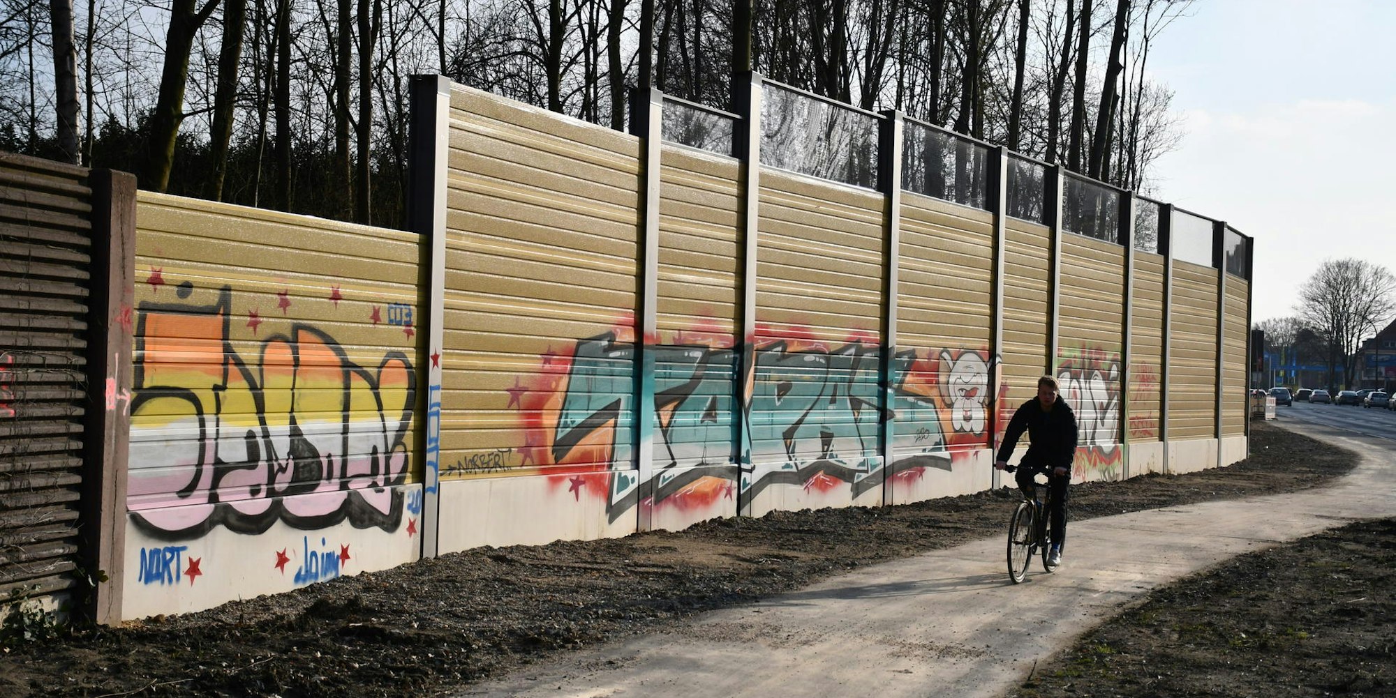 Gerade fertiggestelltNeue Lärmschutzwand an Ortsumgehung in Hürth schon beschmiert