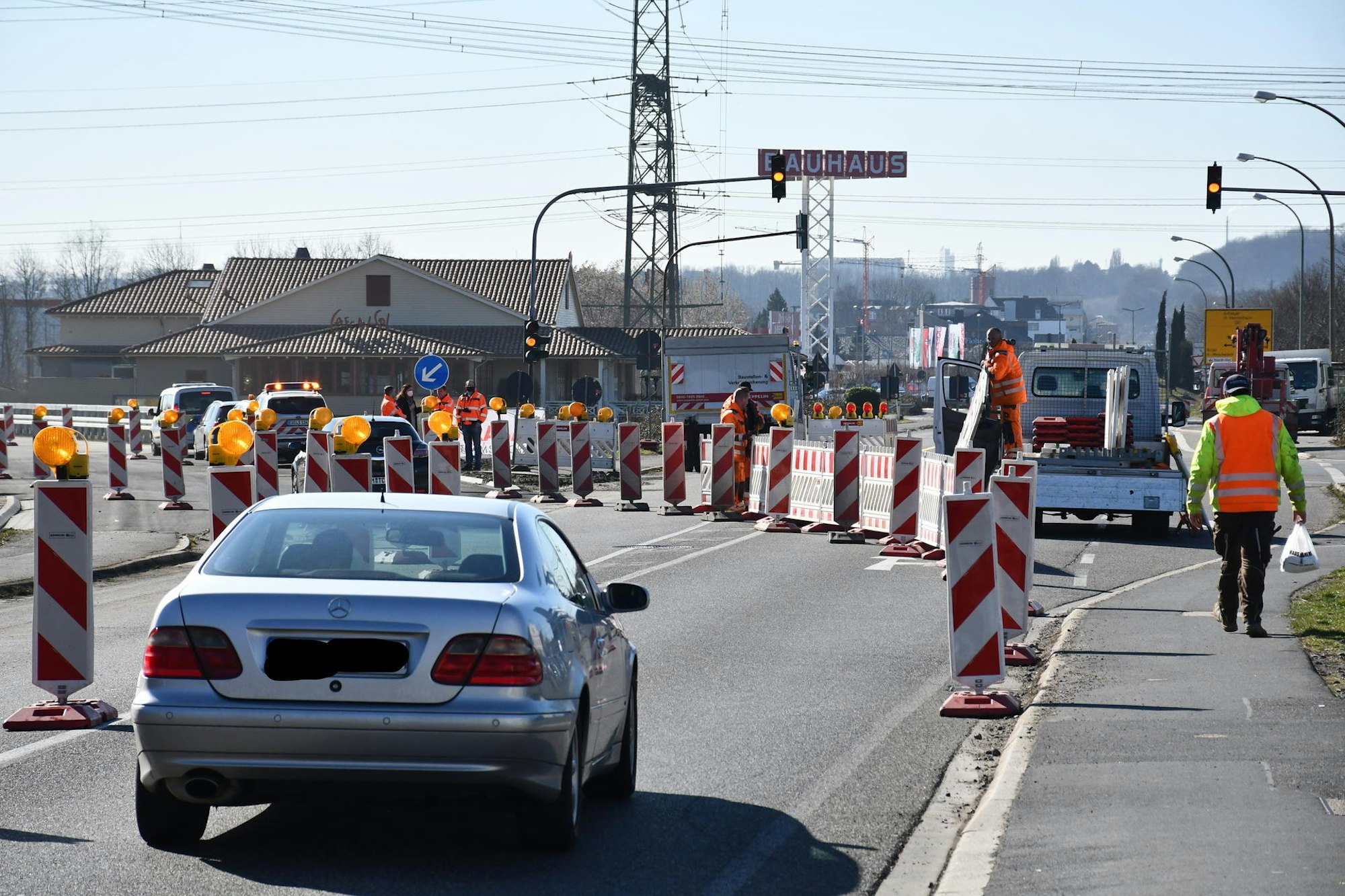 Vor dem „Café del Sol“ wird der Verkehr in Efferen von der Luxemburger Straße auf die Umgehungsstraße gelenkt.