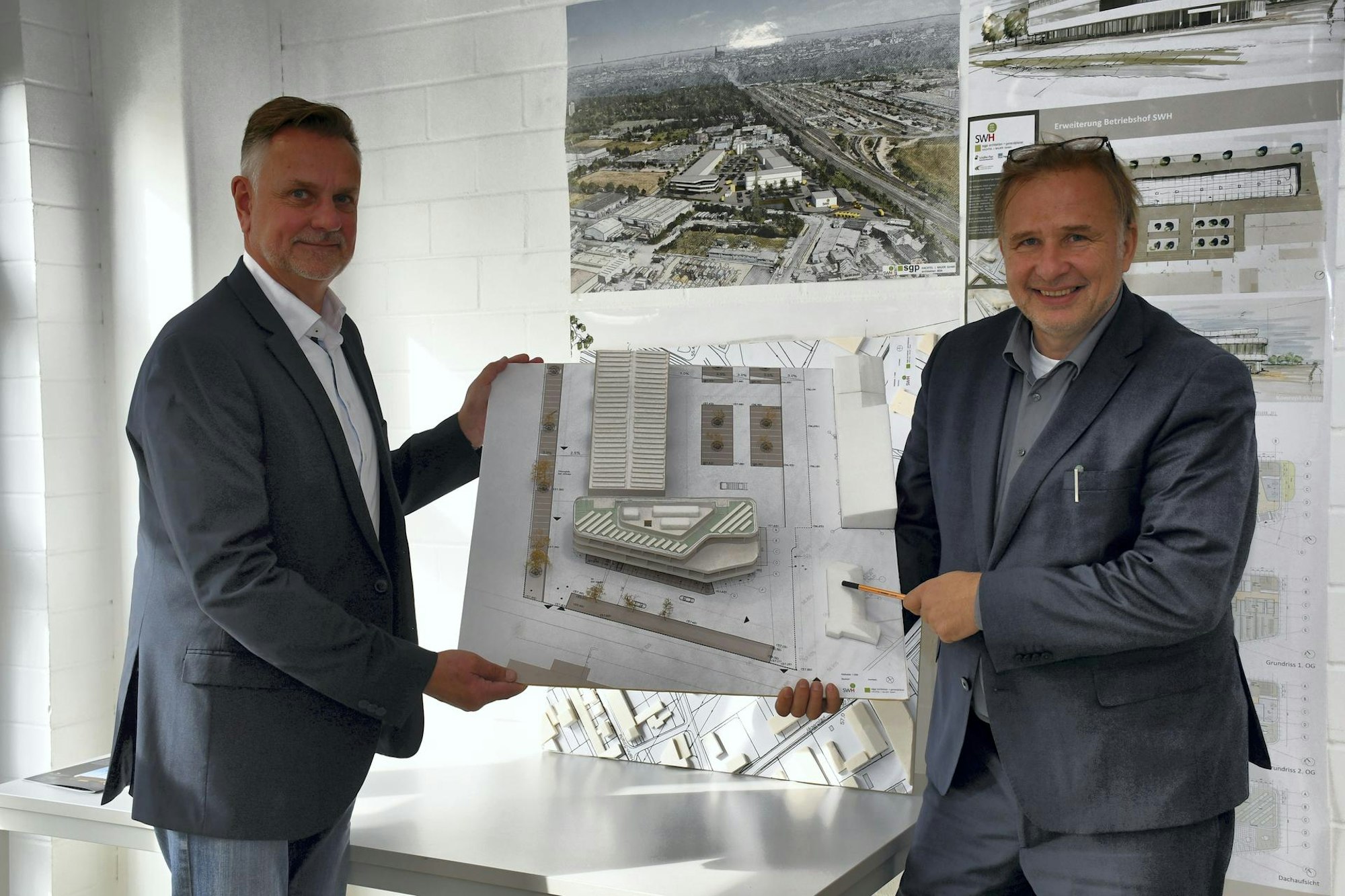 Ein Modell des Betriebsgebäudes der Stadtwerke zeigen Kai Wapenhans (Stadtwerke) und Architekt Friedrich P. Hachtel (r.) .