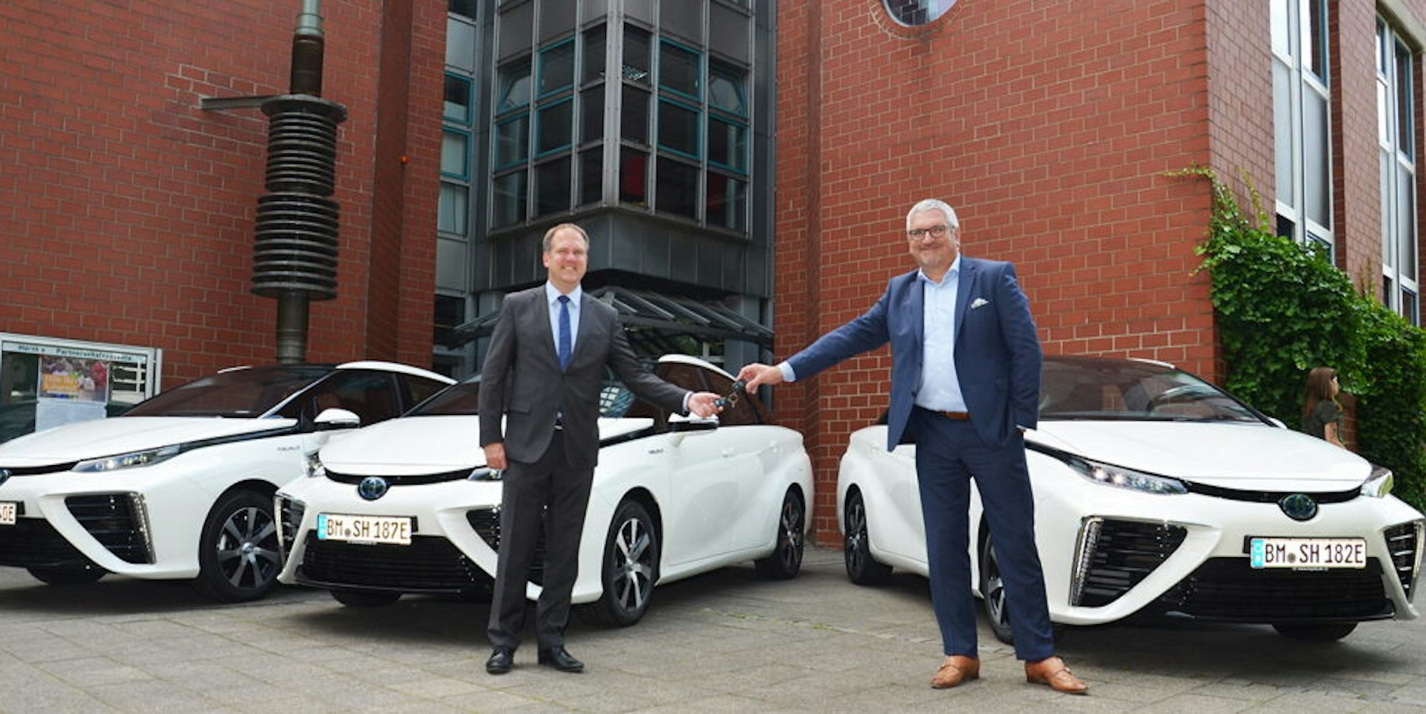 Die Schlüssel für die Wasserstoff-Pkw nahm Bürgermeister Dirk Breuer (l.) von Toyota-Key-Account-Manager Frank Still entgegen.