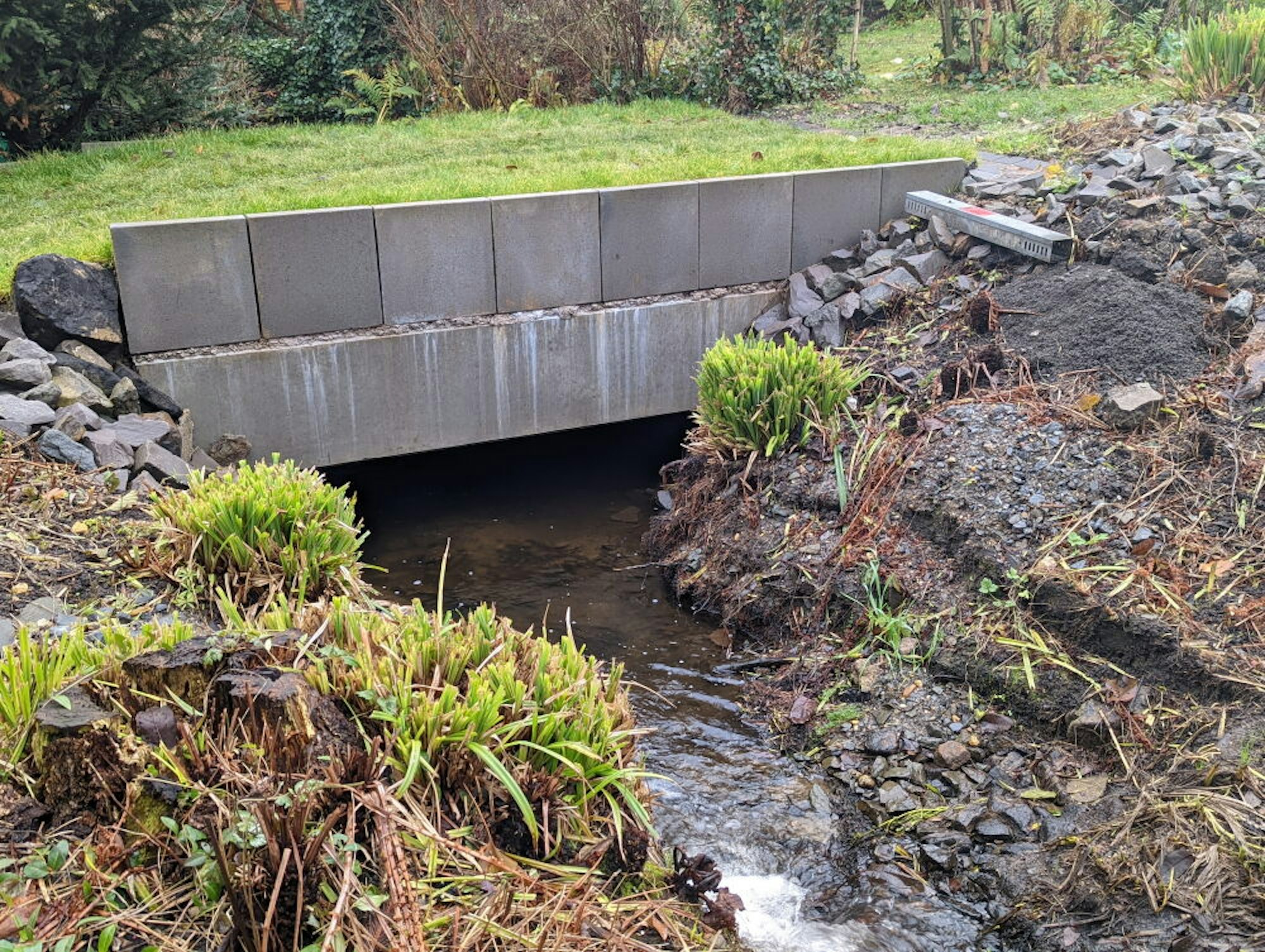 Stein des Anstoßes ist die neue Betonbrücke über den Bachlauf, mit deren Bau im vergangenen Juni, einige Wochen vor der Flut, begonnen wurde. Der Übergang ersetzt eine alte, marode Holzbrücke.