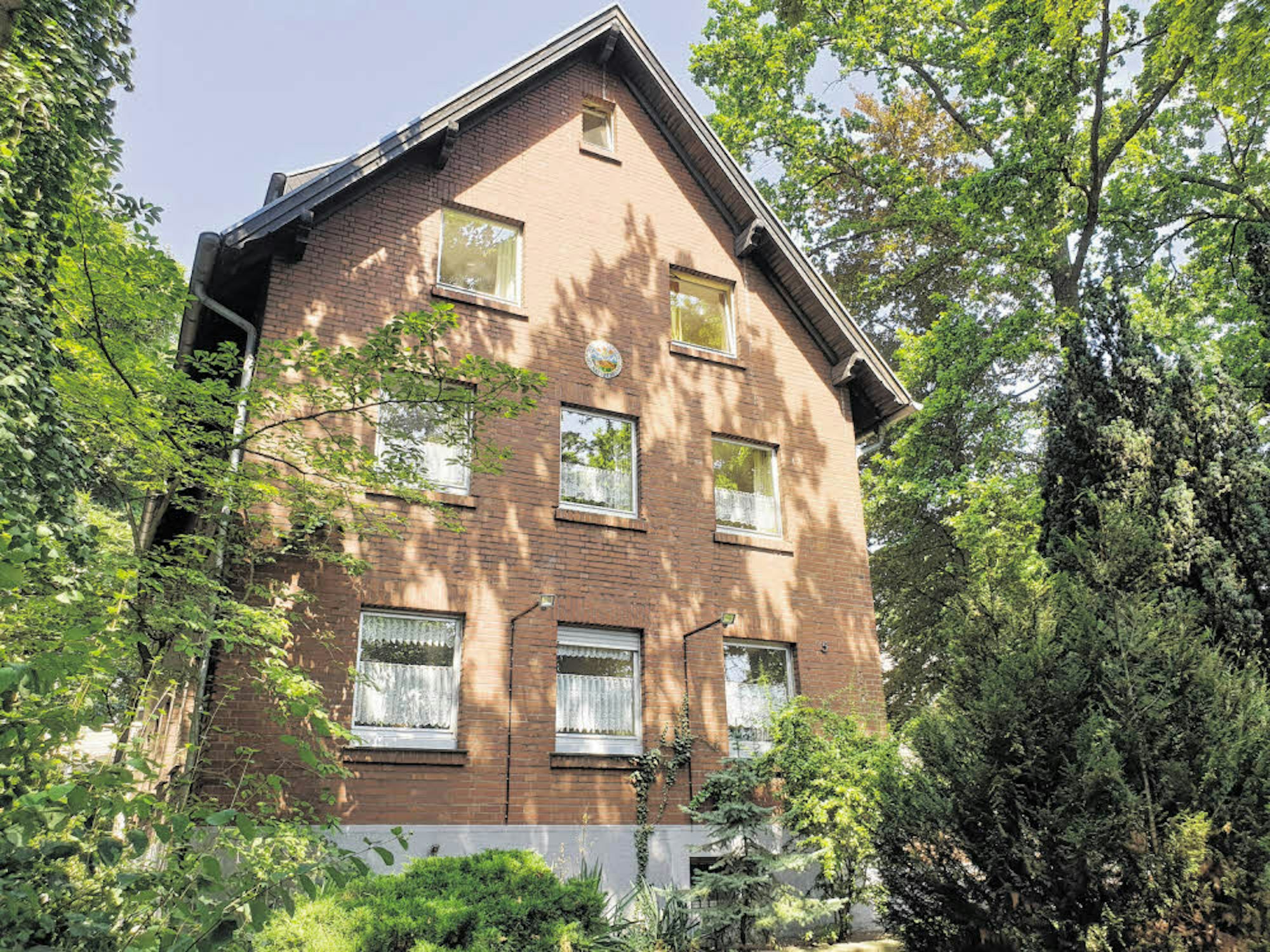 Idyllisch inmitten von Bäumen liegt das Villehaus. Das Treppenhaus musste vor 20 Jahren aus Brandschutzgründen angebaut werden.