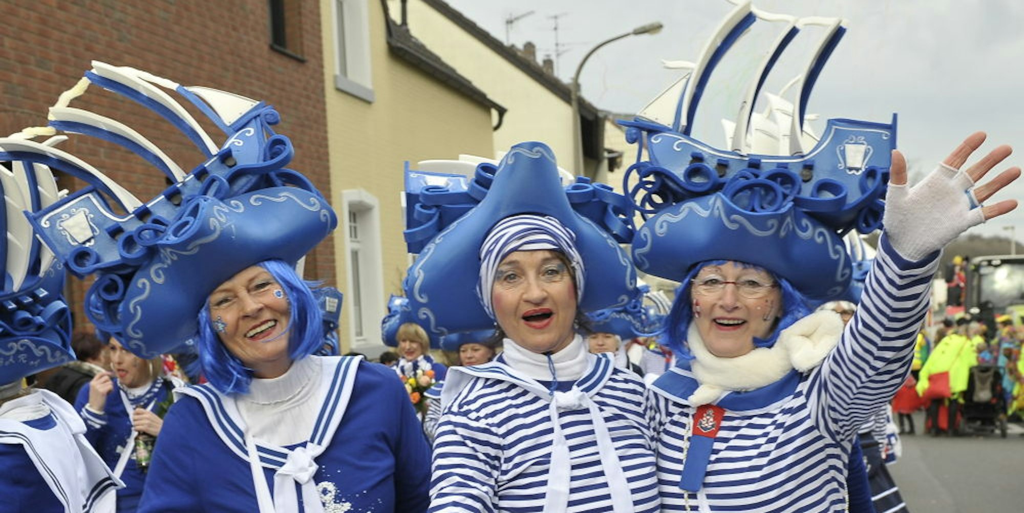 Die Paradiesvögel stürzten sich mit Segelschiffen auf dem Kopf und viel Marineblau unter dem Motto „Ahoi-Mädchen“ in Königsdorf ins närrische Geschehen.