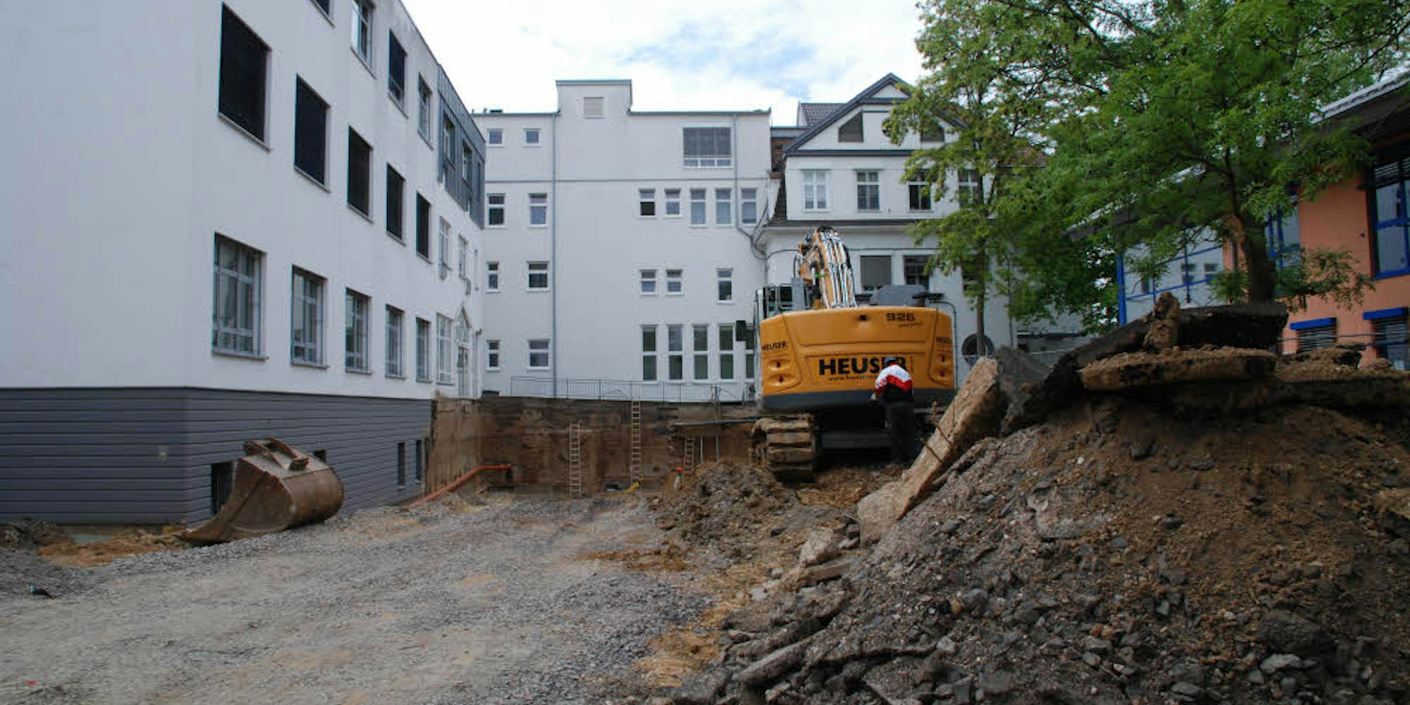 Hürth – Eine großes Loch klafft vor dem früheren Haupteingang des Sana-Krankenhauses. Seit Anfang Mai schachtet ein Bagger die Baugrube aus für die geplante Erweiterung des OP-Trakts im Keller des Krankenhauses.
