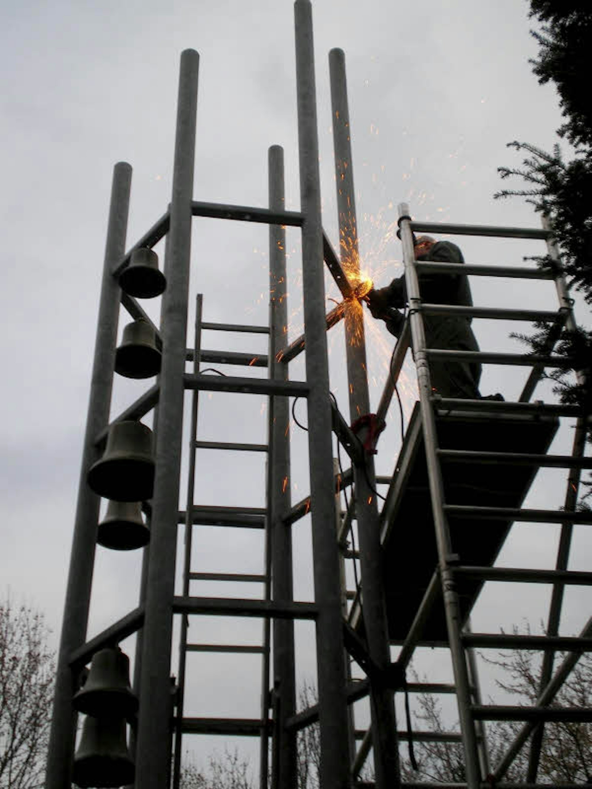 Mit der Flex zerlegten Mitarbeiter der Glockengießerei Voegelé aus Straßburg den alten stählernen Glockenturm vor der Martin-Luther-King-Kirche am Villering.