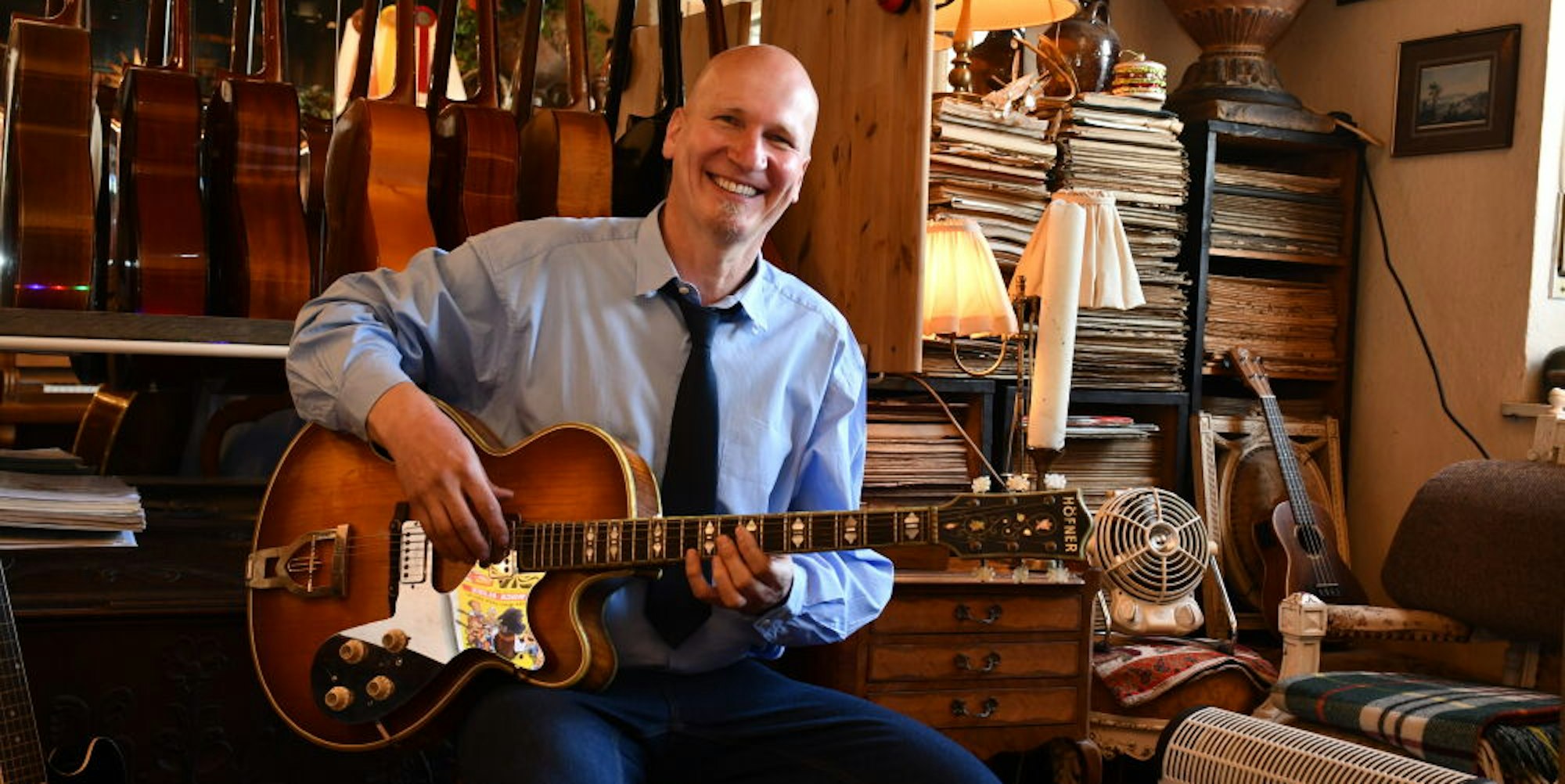 Antiquitäten und Gitarren umgeben Hanno Beckmann in seiner Musikschule in Efferen.