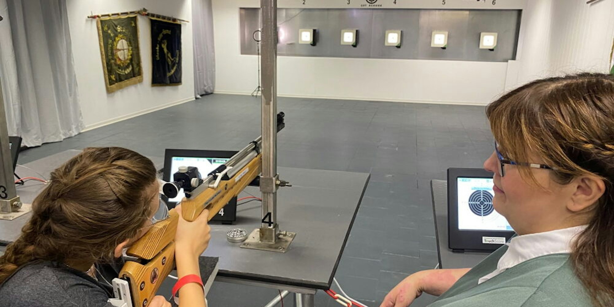 Auf der digitalisierten Schießanlage erprobt sich Lou Buchinger (l.) unter der Anleitung der Jugendleiterin Sabrina Fischer (r.).