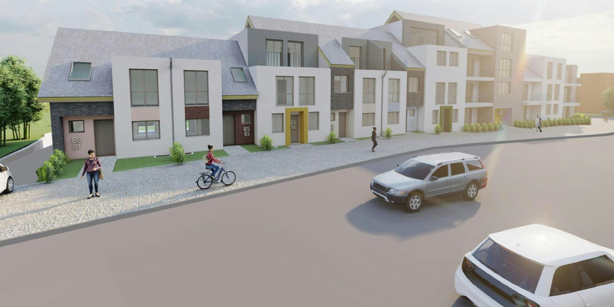 Die Einfamilienhäuser haben eineinhalb, zwei oder zweieinhalb Geschosse und bieten zwischen 91 und 138 Quadratmeter Wohnfläche. Die 15 Wohnungen in den Mehrfamilienhäusern verteilen sich auf Erd- und bis zu drei Obergeschosse.