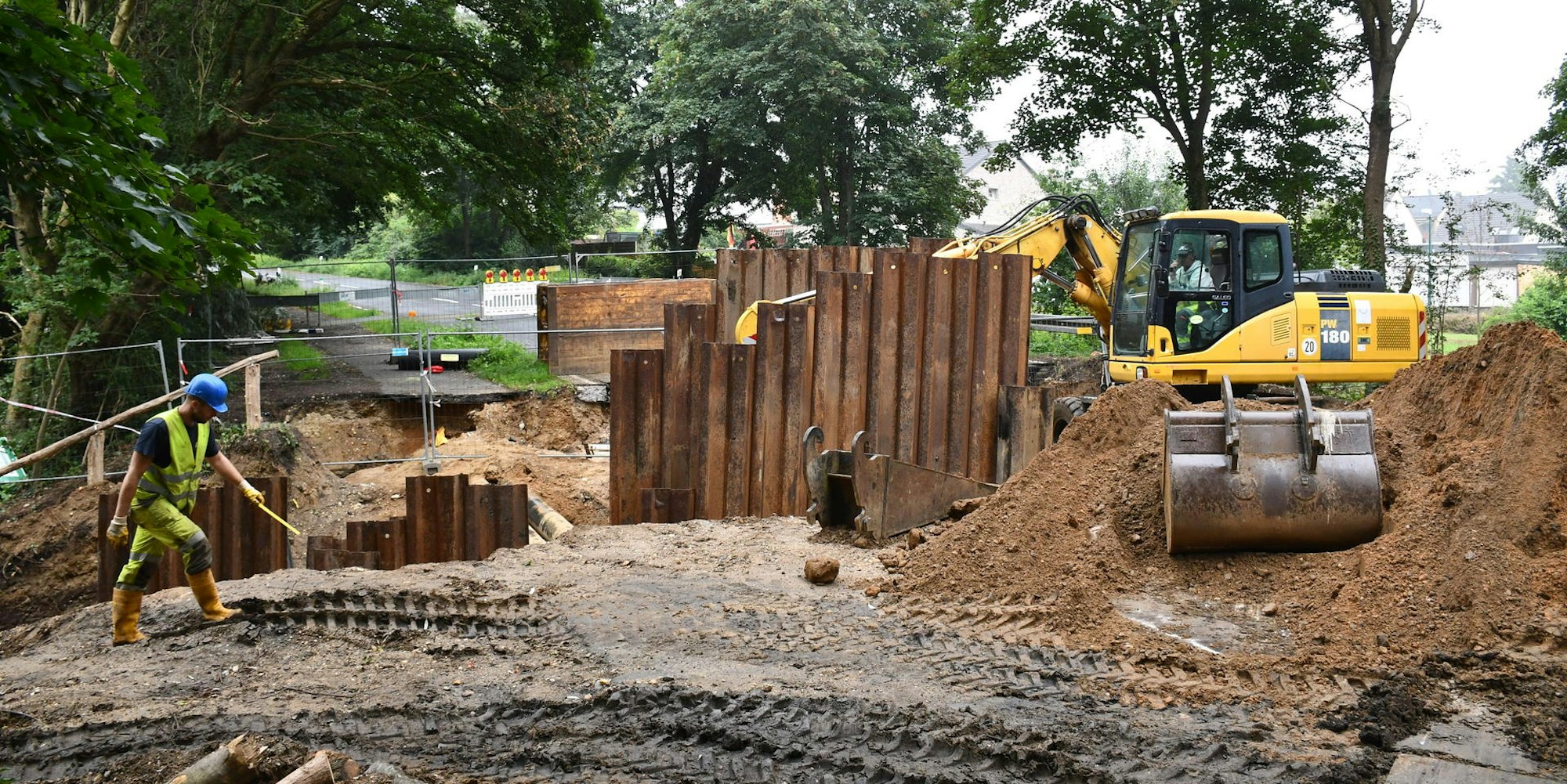 In der durch Spundwände gesicherten Baugrube wird nun ein neues Rohr verlegt. Danach wird der Fahrbahndamm wieder aufgeschüttet und anschließend die Straßenoberfläche wieder hergestellt. „Wir rechnen mit einer Bauzeit bis Mitte Oktober“, so Nilgün Ulbrich.