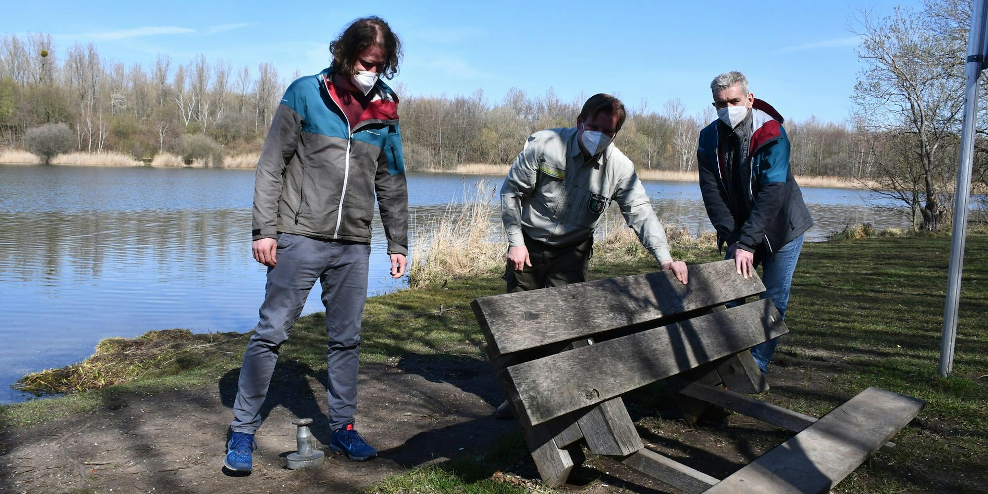 Zerstört wurde diese Sitzbank am Otto-Maigler-See. Dominik Liebenstein, Frank Pechtheyden und Harald Sauer begutachten den Schaden.
