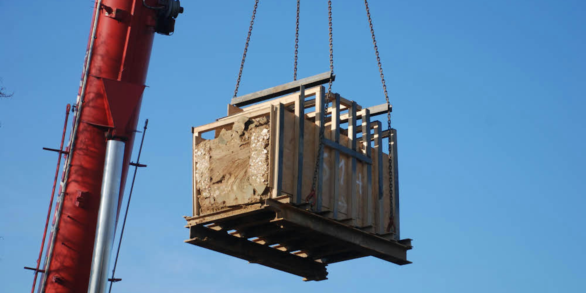 Mehr als 20 Tonnen wiegt das mit Sand und Lehm gefüllte größte Stück des Römerkanals, das mit dem Autokran aus der Grube gehoben wird. Es soll später an den Fundort zurückkehren.