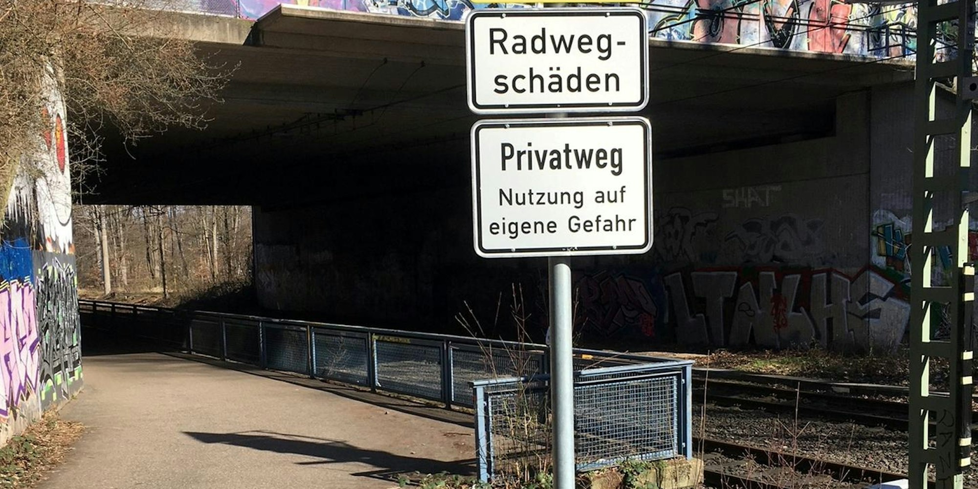 Mit Schildern warnt Gleisnetzbetreiber HGK vor Schäden auf dem Privatweg entlang der Stadtbahngleise.