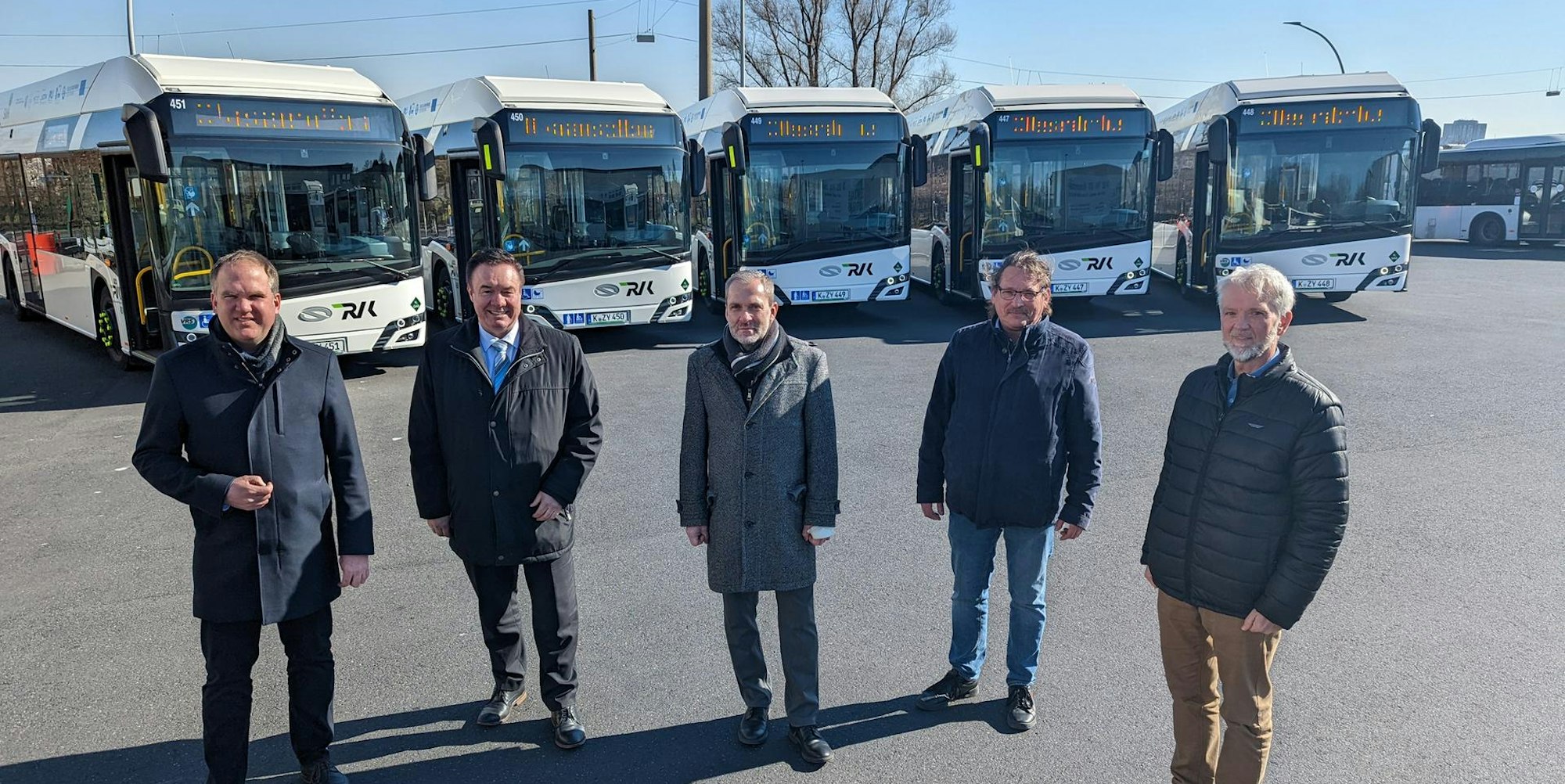 Stolz auf die neuen Busse sind Bürgermeister Dirk Breuer, Stadtwerkechef Stefan Welsch, RVK-Verkehrsleiter Carsten Bußjaeger, Standortleiter Dirk Müller und Mobilitätsleiter Jürgen Wiethüchter.