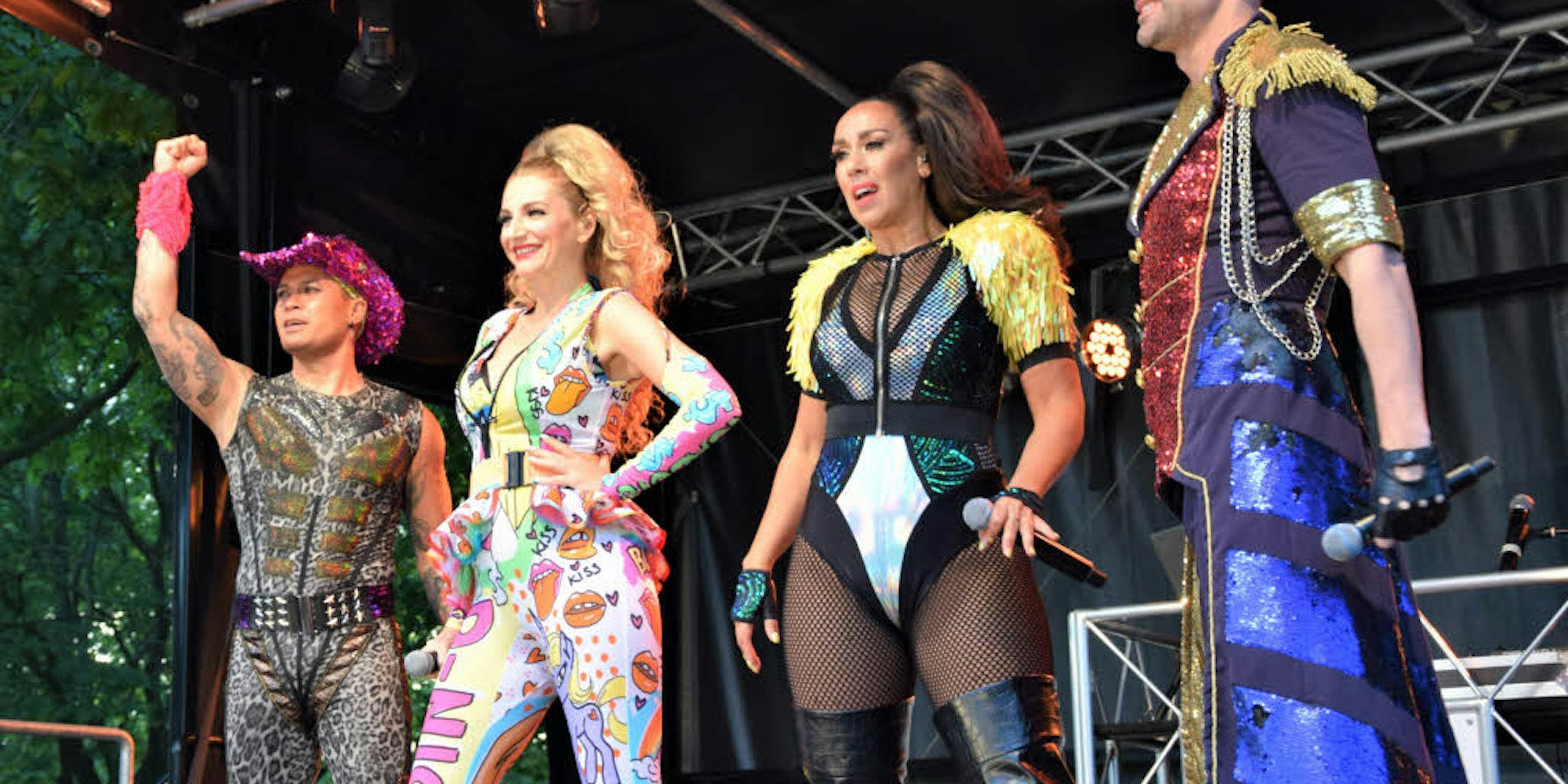 Kurz vor 21 Uhr wurden die Reihen vor der Bühne immer dichter. Denn es kündigte sich der Höhepunkt des Abends an: der Auftritt der Vengaboys. Kreischend wurde die Gruppe mit den vier Musikern von den Fans begrüßt. Die niederländische Eurodance-Band, bekannt aus den 90ern mit stampfenden Beats und skurrilen Klamotten wie glitzernden Cowboyhüten, Kuhfell-Büstenhaltern und hochmodernen Plateauschuhen, feiert gerade ein Comeback.