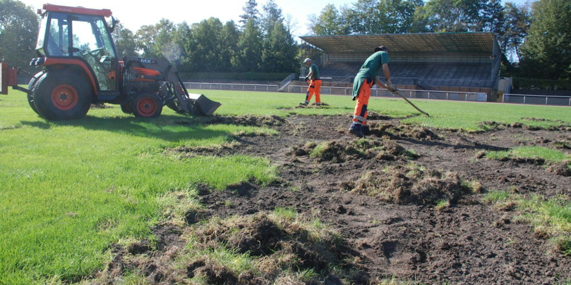 Unterdessen hat die Stadionkolonne mit der Instandsetzung begonnen. Nach dem Auffüllen des Bodens sollen große Löcher mit Rollrasen ausgebessert werden, an kleineren Schadstellen wird neu eingesät. Bis der Rasen angewachsen sei, dauere es drei bis vier Wochen, so Bauhofleiter Schmidt.