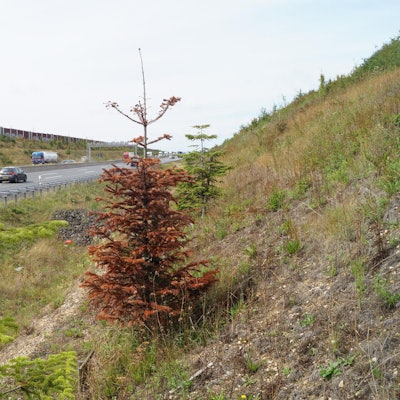 Die Autobahn zur einen Seite, die Bahnlinie zur anderen; und dazwischen Bäume, von denen einige dort einfach nicht wachsen.