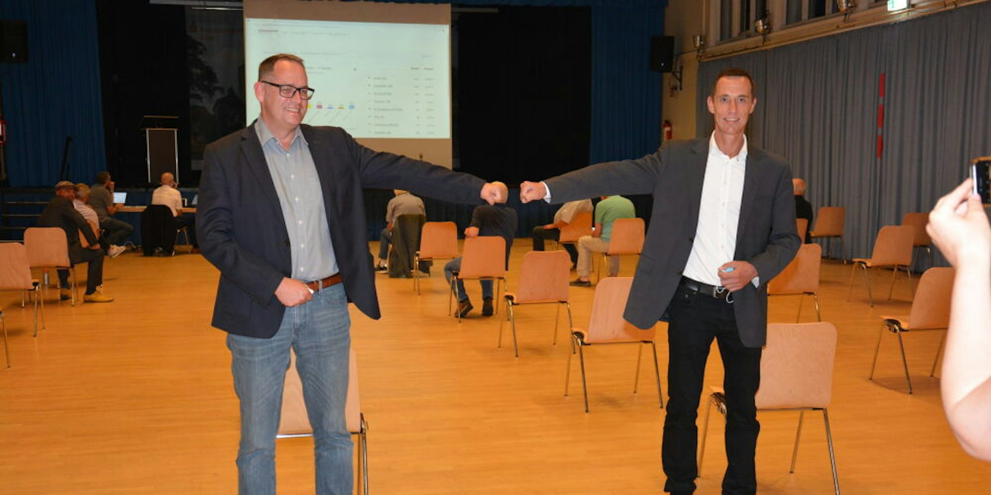 Dieter Spürck (CDU) und Andreas Lipp (SPD) (v.r.) kommen in die Stichwahl für das Bürgermeisteramt. In der Jahnhalle hielt sich der Andrang der Bürger bei der Präsentation der Wahlergebnisse in Grenzen.