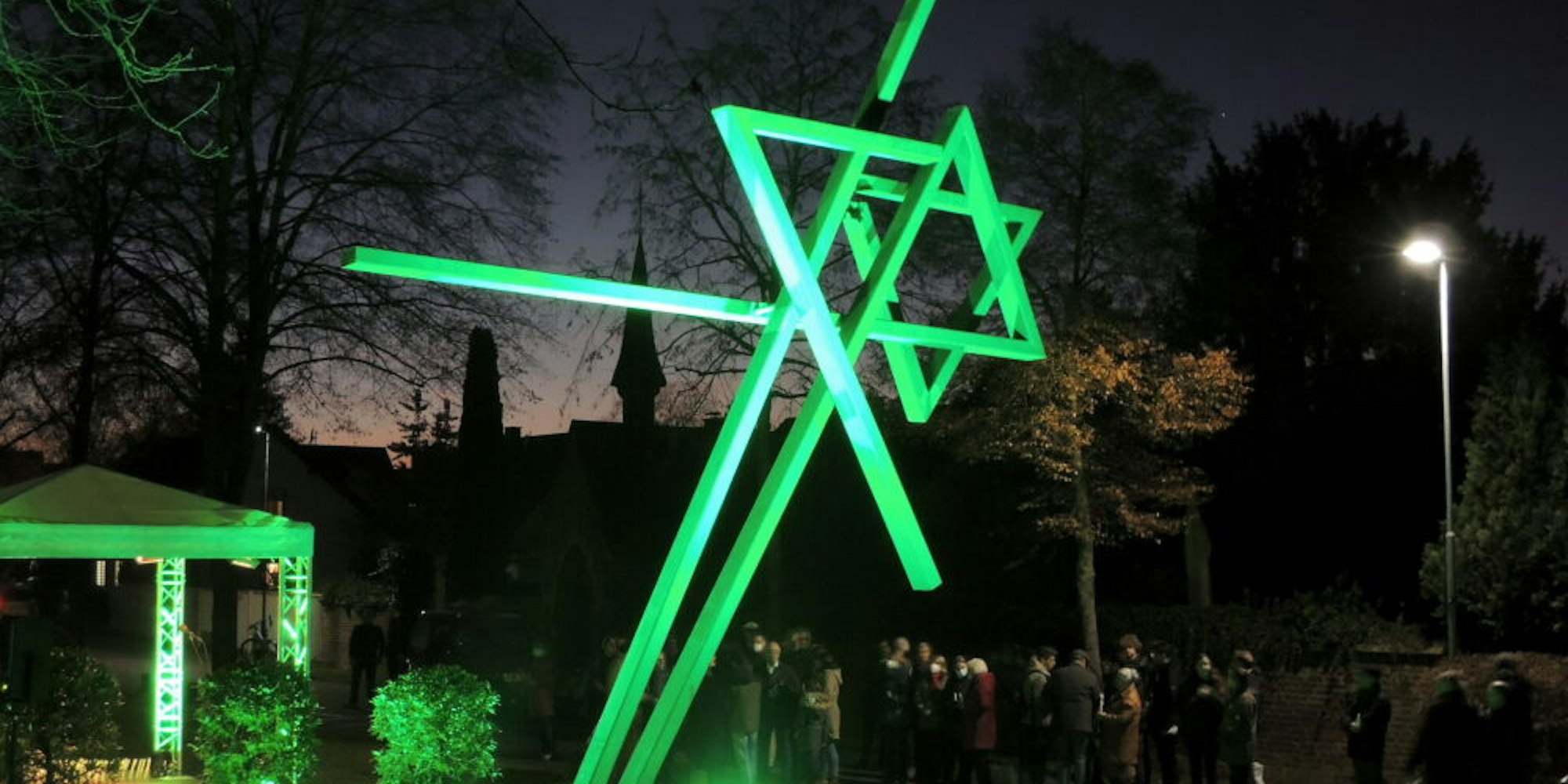 Am grün erleuchteten Mahnmal an der Alten Landstraße gedachten zahlreiche Kerpener mit Kerzen der Pogromnacht.