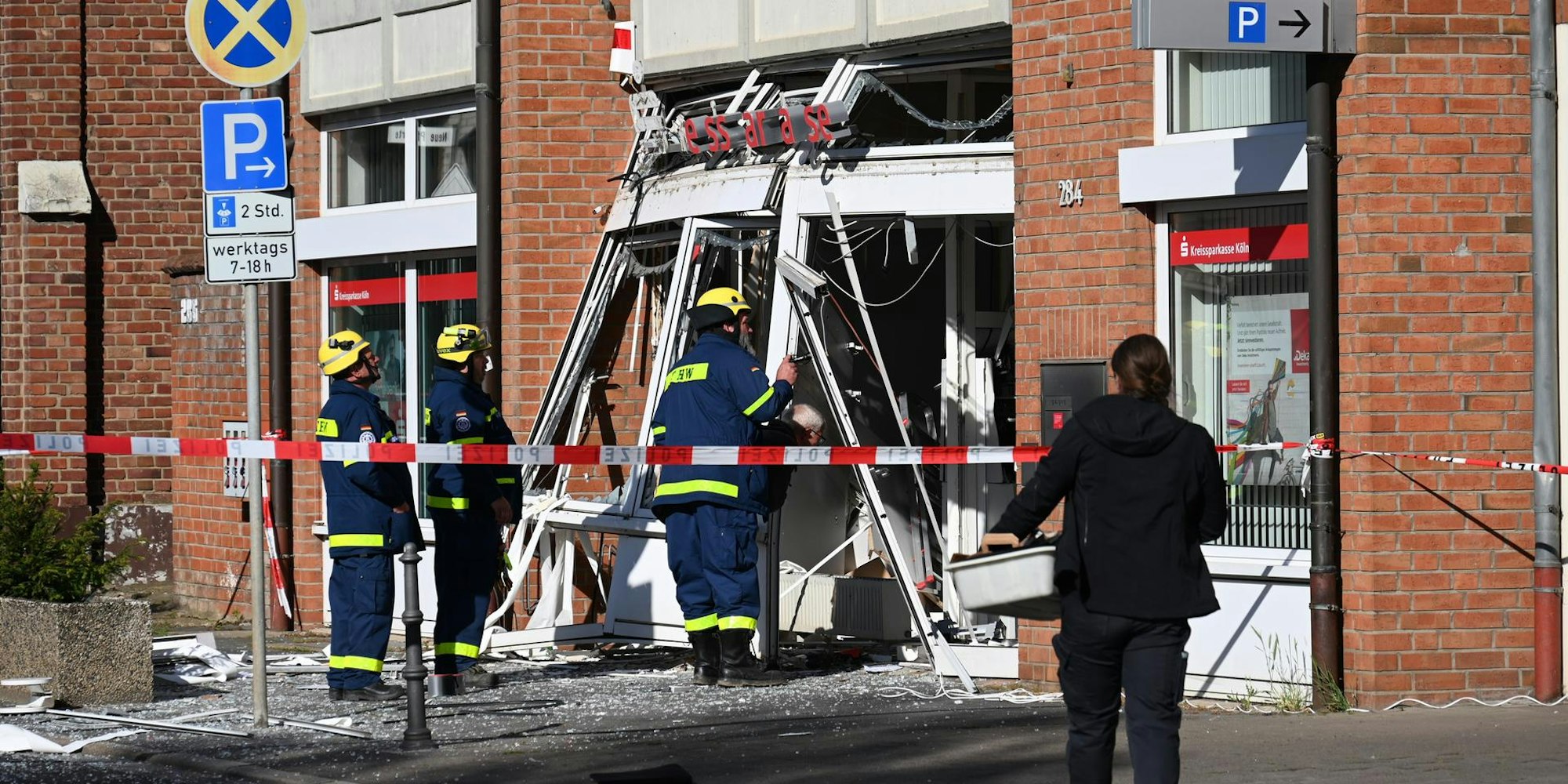 Trümmerteile des Gebäudes und Glassplitter lagen weit verstreut auf der Dürener Straße. Die Fassadenverkleidung wurde durch die Detonation aus ihrer Verankerung gerissen. Einige Anwohner, die neben und über der Bankfiliale wohnen, standen beim Eintreffen der Beamten schockiert auf der Straße. Alle weiteren Nachbarn wurden von der Polizei und der Feuerwehr aus ihren Wohnungen ins Freie begleitet und anschließend betreut.