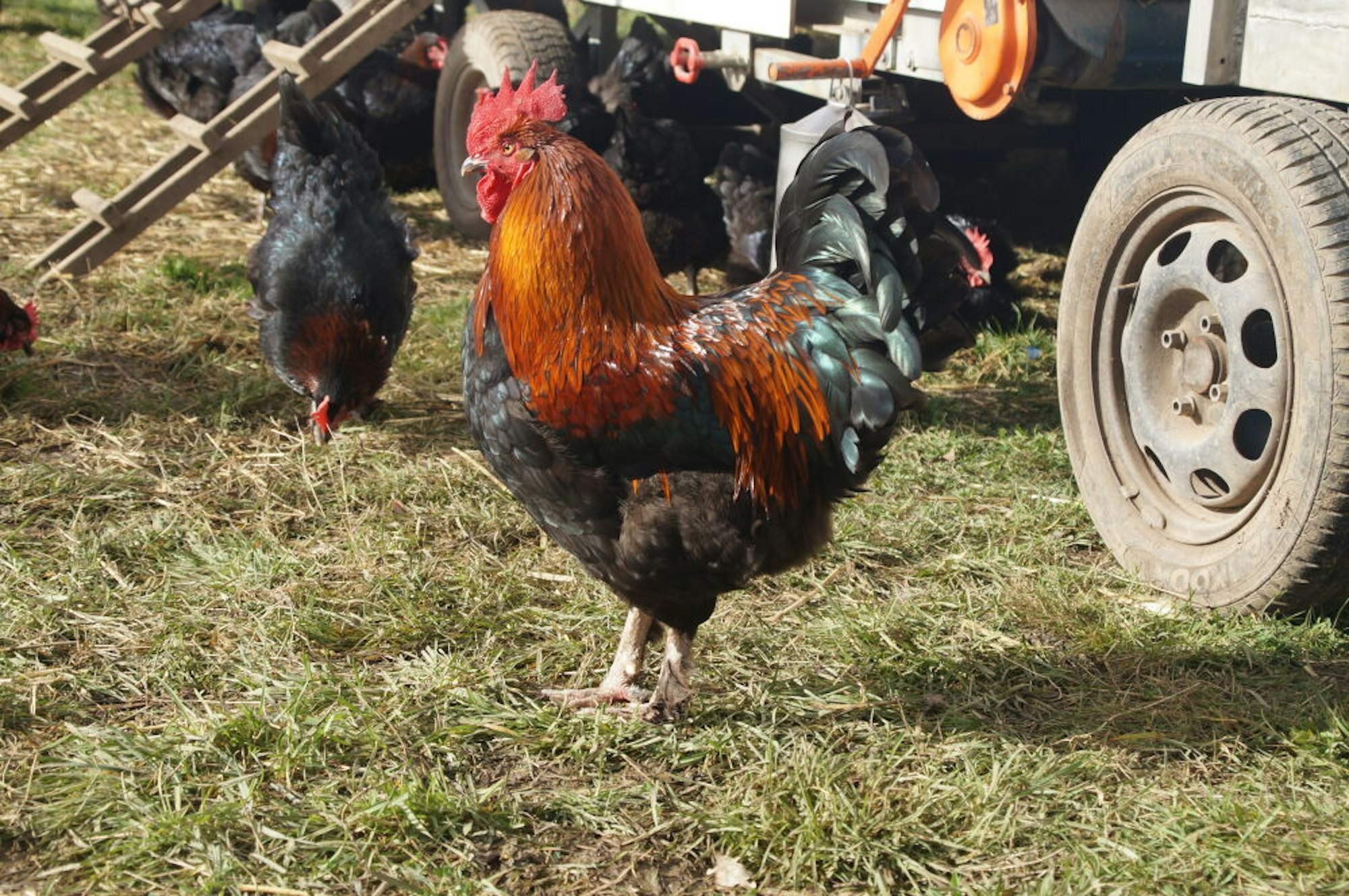 Der Hahn präsentiert stolz seine Federn und passt auf die Hennen auf.