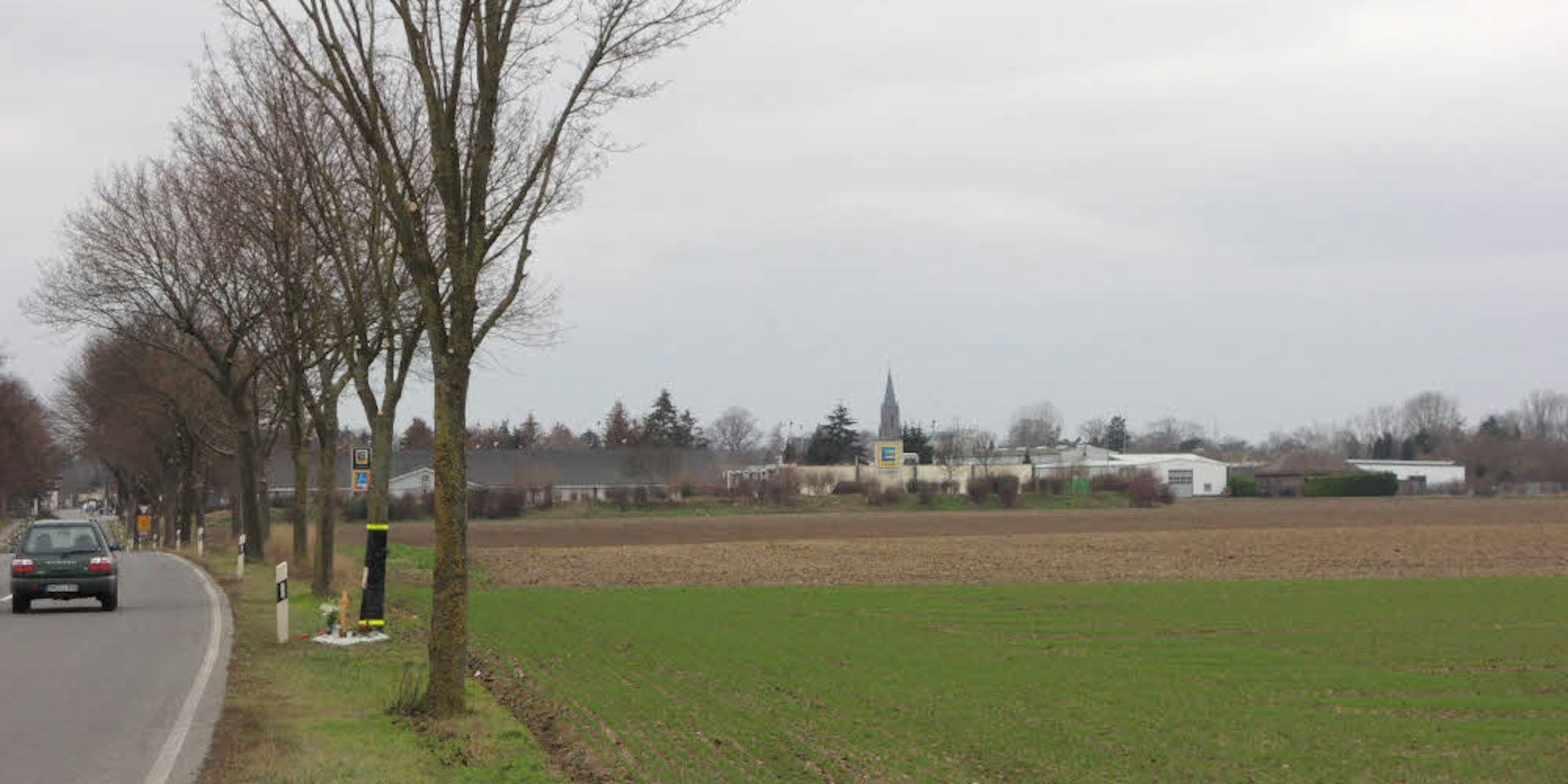 Wenn man von Blatzheim aus auf Buir zufährt, liegt das geplante Gewerbegebiet rechts neben dem Einkaufszentrum.