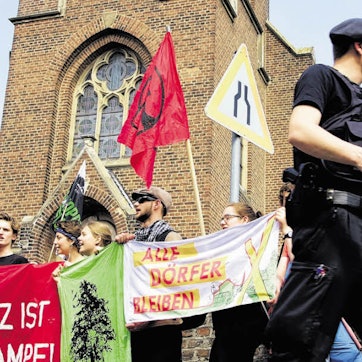 Während sich draußen Protest von auswärtigen Klimaschützern regte, nahmen die Manheimer selbst drinnen leise Abschied. Sie hatten sich vorher anmelden müssen, beim Zugang mussten mehrere Sicherheitskontrollen passiert werden. Gemeinsam mit vier weiteren Geistlichen zelebrierte Ludger Möers als Pfarrer des Kirchengemeindeverbandes Kerpen-Südwest den Gottesdienst. Auf eine Predigt verzichtete Möers und überließ stattdessen den Manheimern selbst das Wort.