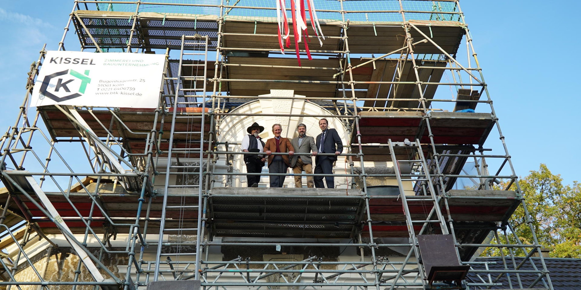 RFH-Präsident Martin Wortmann verschaffte sich einen Überblick über den zukünftigen Campus der RFH in Türnich und stieg gemeinsam mit Schlosseigentümer Godehard Graf von und zu Hoensbroch, Architekt Zoltan von Mohos und Zimmermann Peter Kissel auf das Gerüst am Torhaus. Abgeschlossen werden sollen die Arbeiten noch im Laufe dieses Jahres.