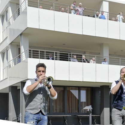 „Wir wollen den Senioren hier eine kleine Freude machen“, erläuterte Renate Clemens, die für die Musikschule Kerpen betreut. Also habe man jugendliche und erwachsene Schüler und Lehrer zusammengezogen, die nun im Hof des Seniorenheimes abwechslungsreiche Unterhaltung bieten konnten. Neben Sängerinnen und Sängern gab es auch eine erstaunliche Vielfalt an Instrumenten. So kamen etwa Klarinette, Saxofon und Posaune zum Einsatz.