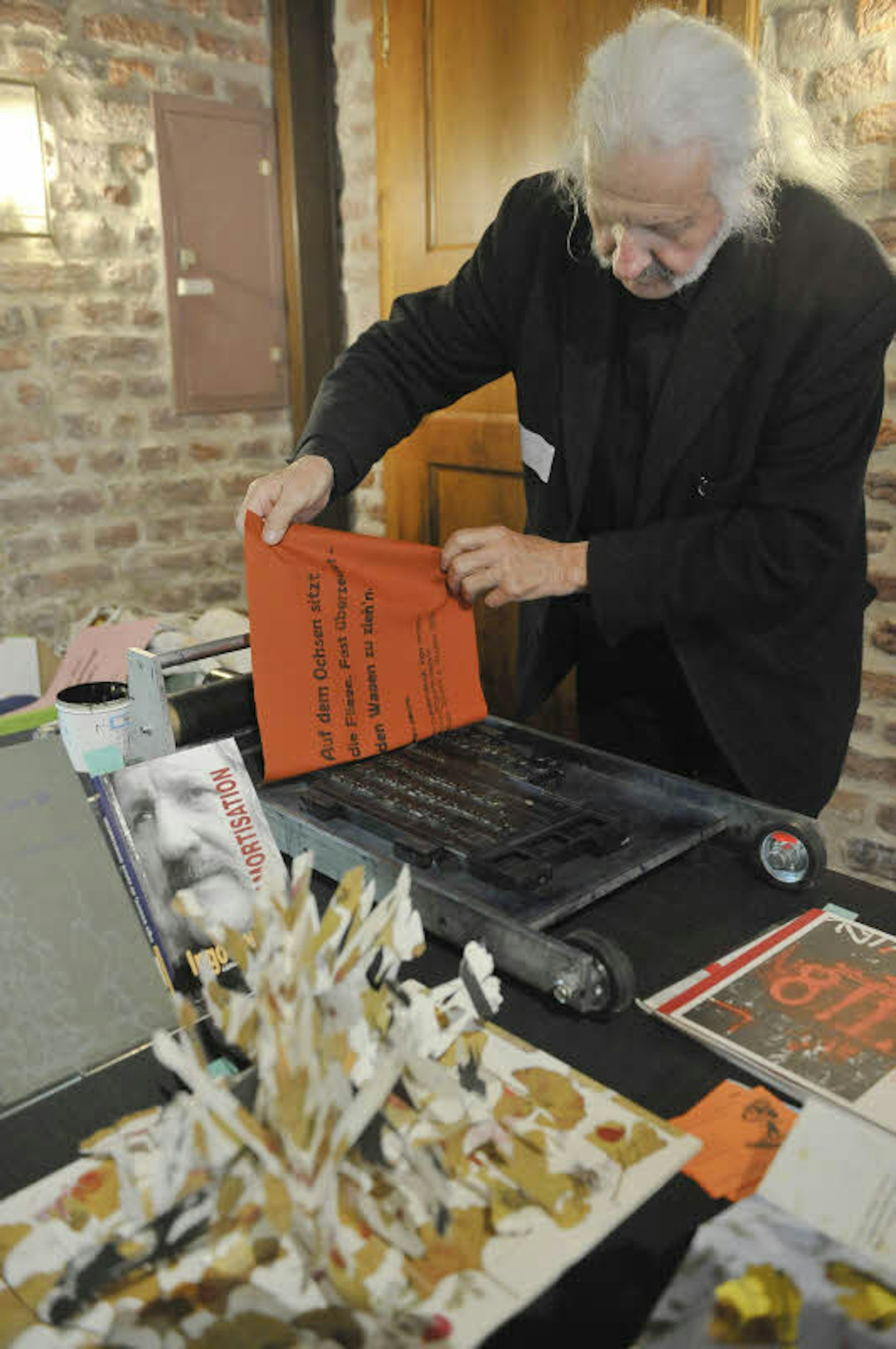 Dichter und Künstler Ingo Cesaro beschwor die Kraft des Ginkgo und bediente eine mobile Druckerpresse.