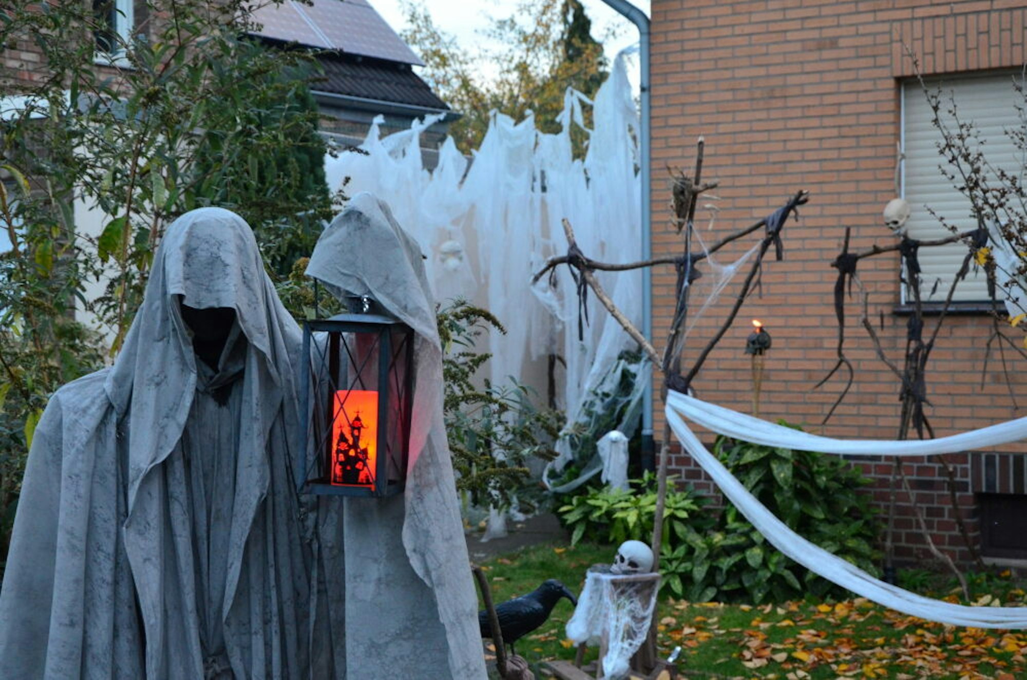 Kerpen – Der Tod lauert in Schiffers Vorgarten. „Ich nenne ihn meinen Wächter“, sagt Thomas Schiffer über die gesichtslose Figur, die zu den ersten seiner selbst gebauten Halloween-Objekte gehört. Der Wächter streckt Besuchern auch am Abend vor Allerheiligen ein Friedhofslämpchen entgegen. Seit drei Jahren verwandelt sich der Vorgarten von Familie Schiffer zu Halloween in ein Gruselkabinett.
