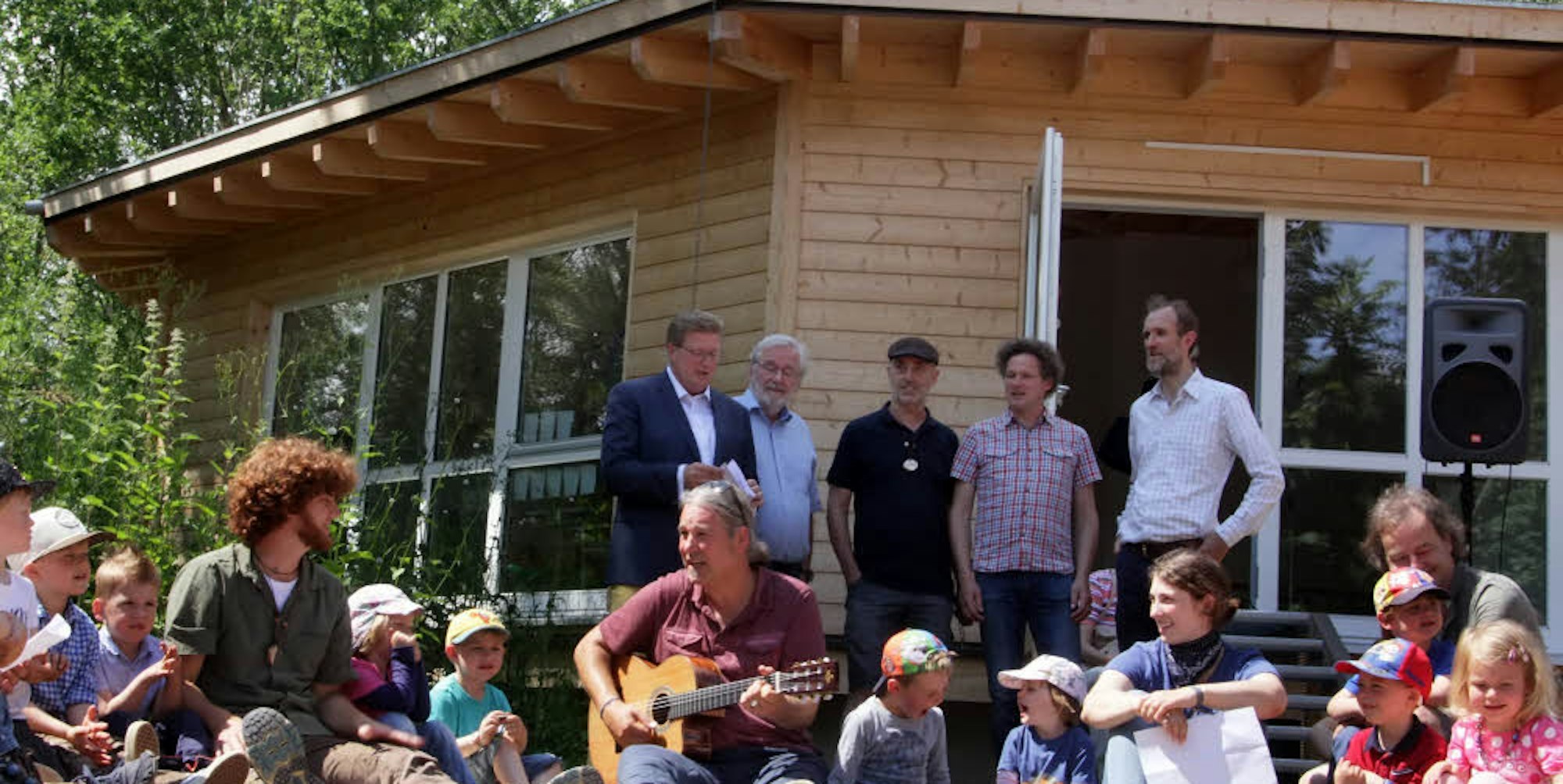 Groß und Klein stimmten zur offiziellen Eröffnung des neuen Holzhauses ein Lied an.