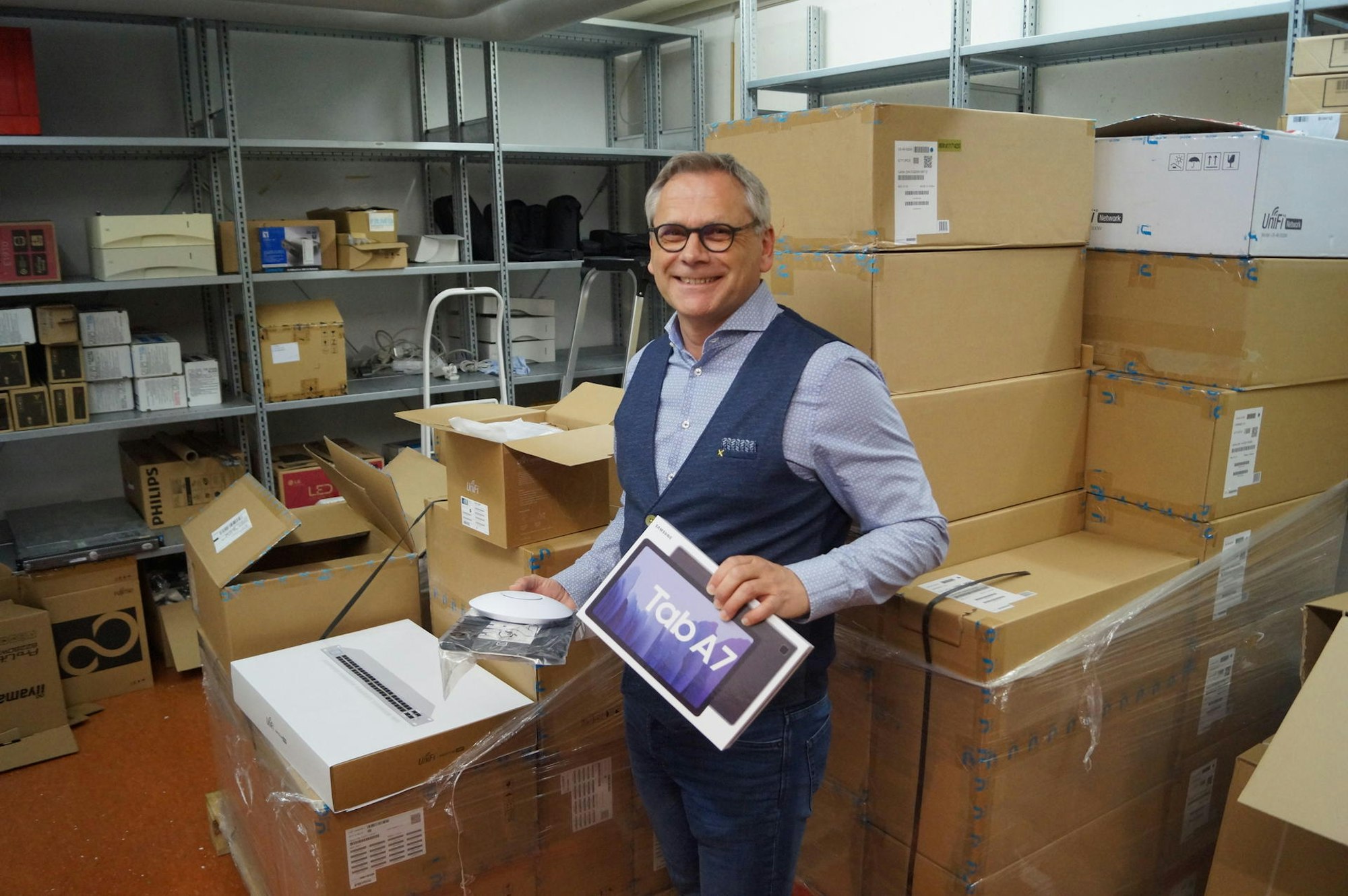 Hans Arnold Maus, Amtsleiter Soziales und Schulen, vor einem Berg mit Kartons. Sie enthalten Netzwerkkomponenten.