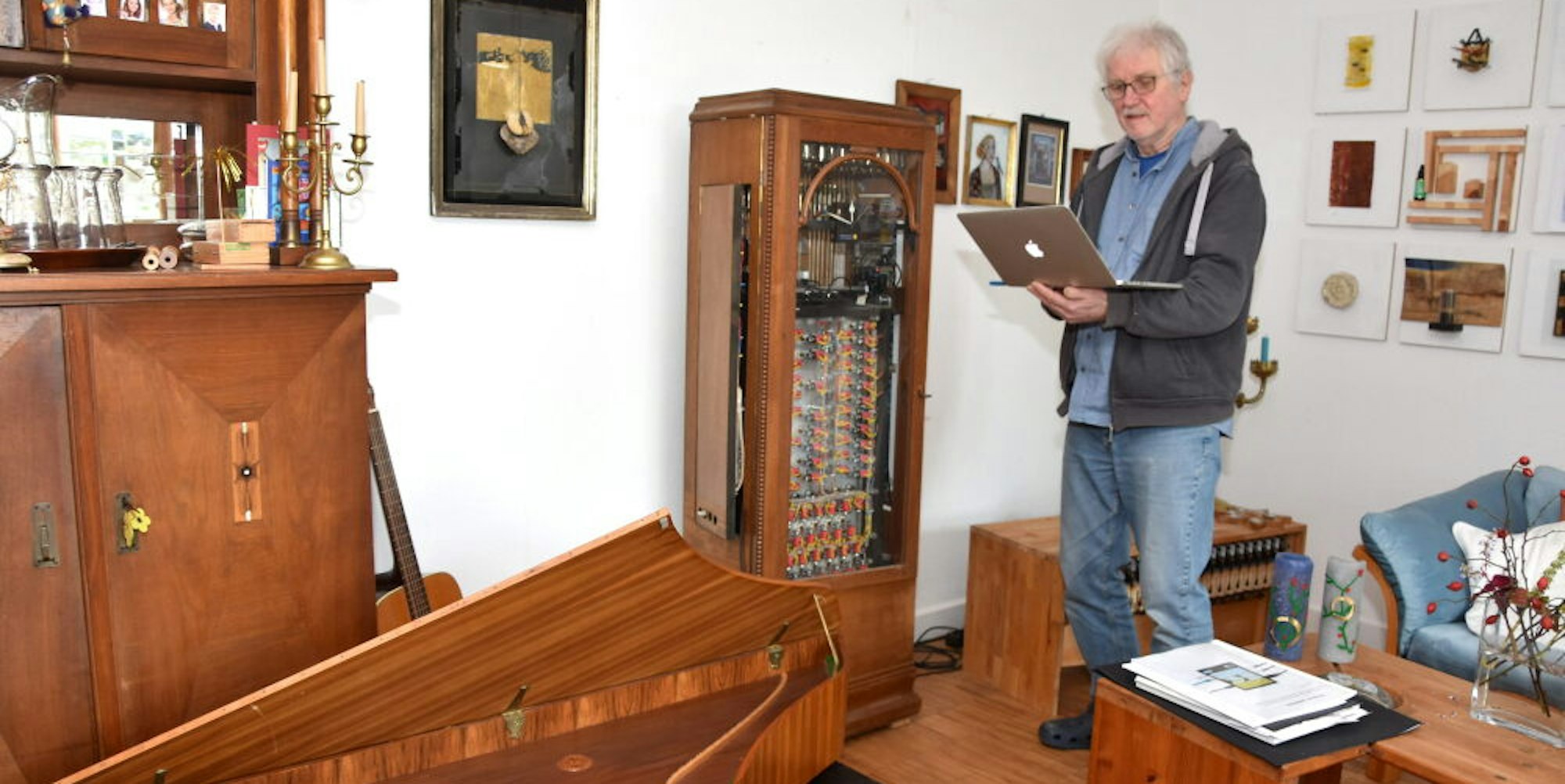 Die Installation mit Spinett (vorn), Xylophon (hinten) und den drei Klangmaschinen im Uhrkasten steuert Gerhard Kern mit dem Laptop.