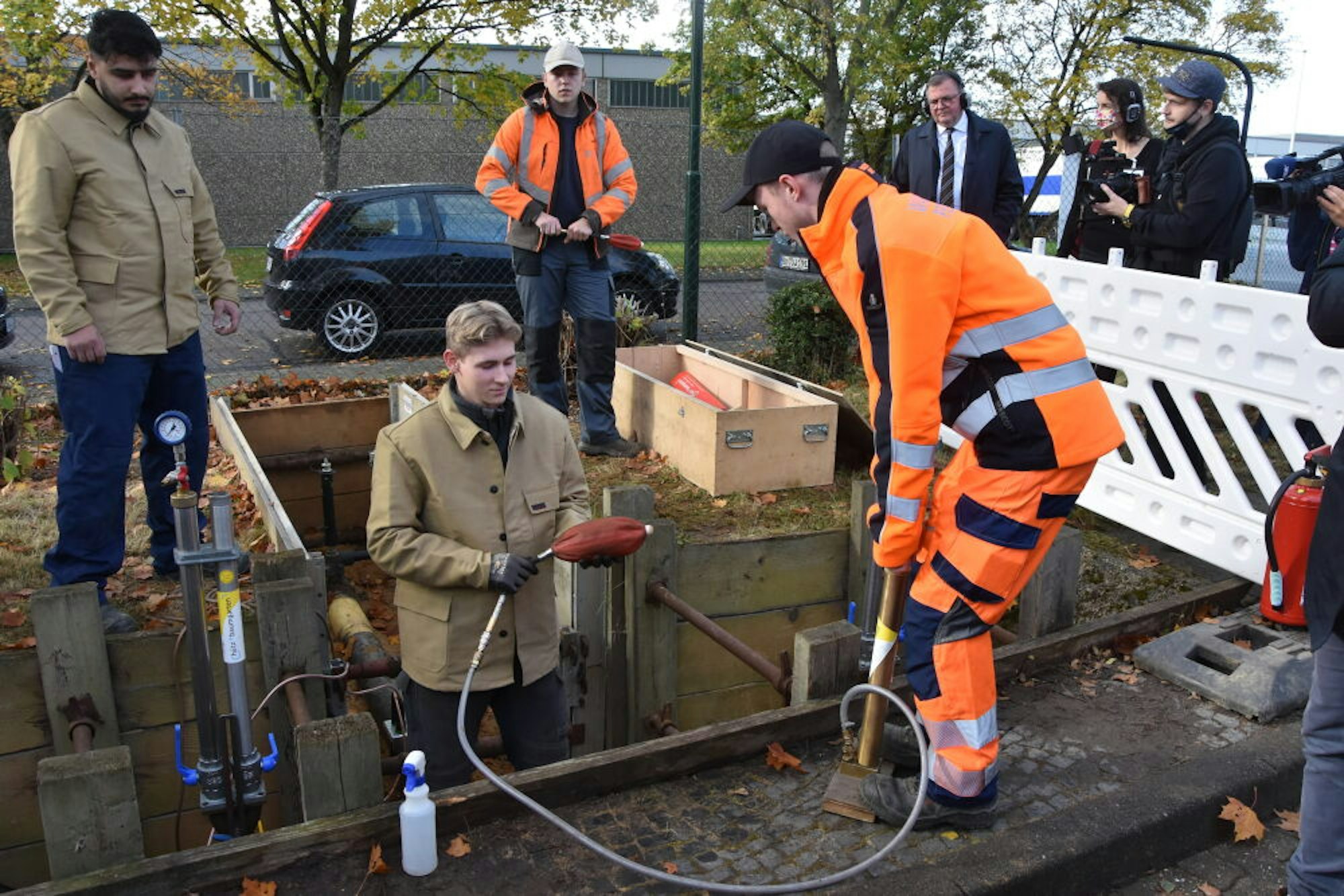 Nicola Dern (19) aus Erftstadt, einzige weibliche Auszubildende im Jahrgang, zeigt mit ihren Kollegen, wie eine Erdrakete das Ausheben von Gräben erspart. Mit Druckluft wird ein Kanal waagerecht ins Erdreich geschossen, der später die Leitung aufnehmen soll. „Das ist ein spannender und vielseitiger Beruf“, sagt die angehende Gesellin, die ihre Ausbildung bei den Hürther Stadtwerken macht, im Zentrum Praxis und in der Berufsschule Theorie erlernt.
